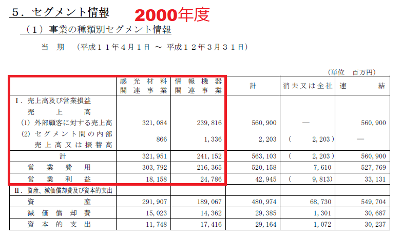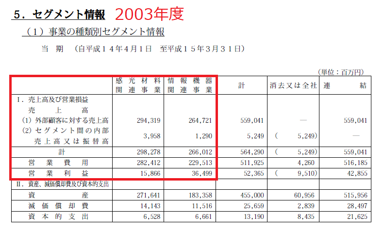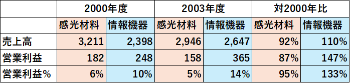 ★ 画像はクリックすると拡大しますが 2000年度と2003年のセグメント別売上高・営業利益を比較すると、全体が伸びていない中で感材関連が減少し、情報機器関連が伸びていることが分かります。