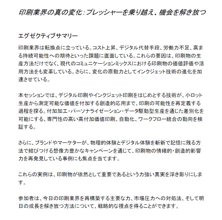 ![]() 印刷の未来(インクジェット視点を追加依頼中) Charles Lissenburg, Group Director Production Services Keypoint Intelligence LLC 詳細はここをクリック Click to see the detail |