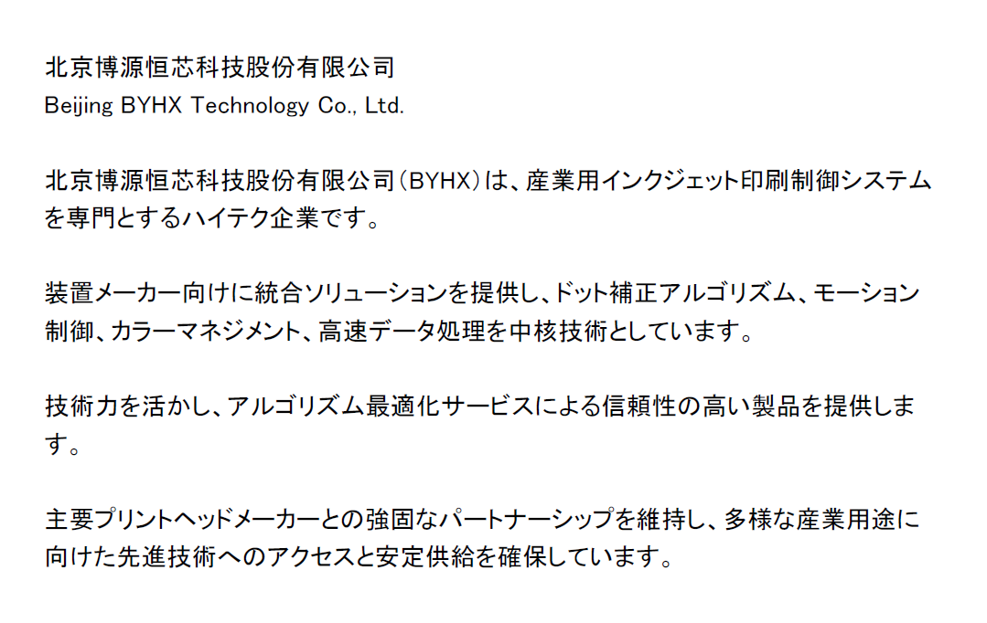 ![]() 当社のインクジェットシステムソリューションは、4つの技術的柱を通じて製造に革命をもたらし、テキスタイル、エレクトロニクス、建築資材におけるマス・カスタマイゼーションを実現すると同時に、効率性と持続可能性を推進します。 SUN ZHI 孙志 General Manager CHI JINGYAO 迟静瑶 Overseas Marketing Manager 詳細はここをクリック Click to see the detail |