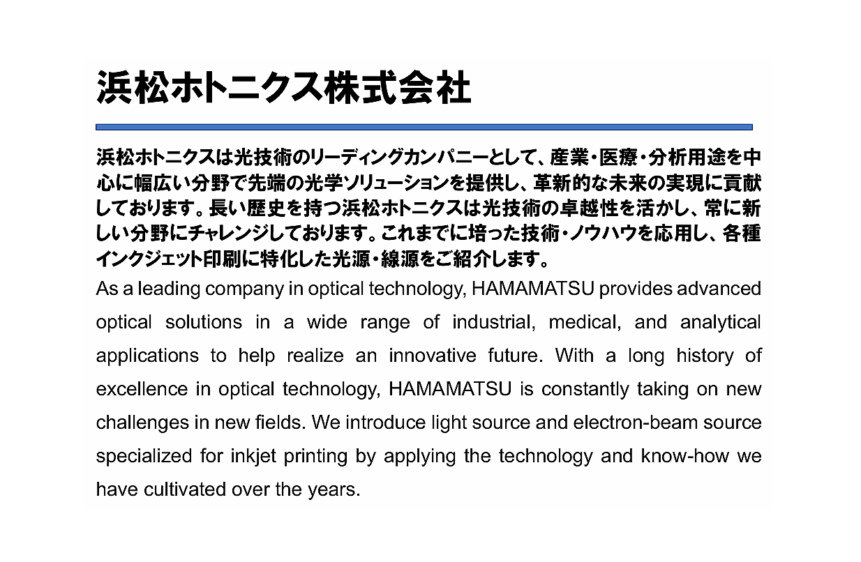 ![]() 本発表では電子線(以下、EB)を用いた印刷技術の特長と、EB印刷に最適な弊社 低エネルギー電子線源についてご紹介します。Yuki Watanabe 渡邊 祐貴 Hamamatsu Photonics K.K. – Engineer 詳細はここをクリック Click to see the detail |