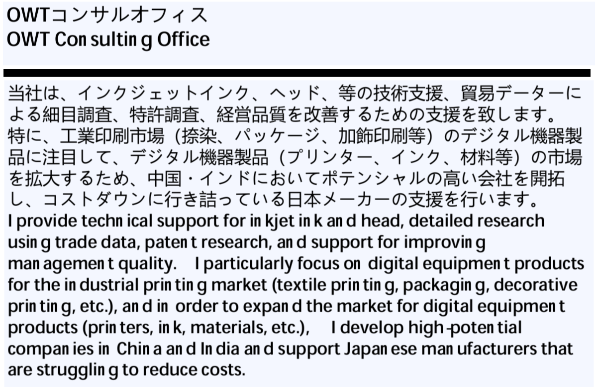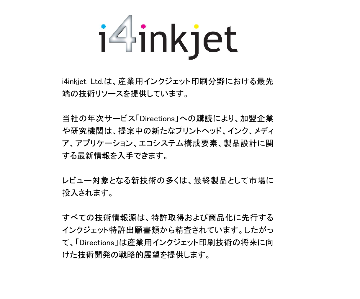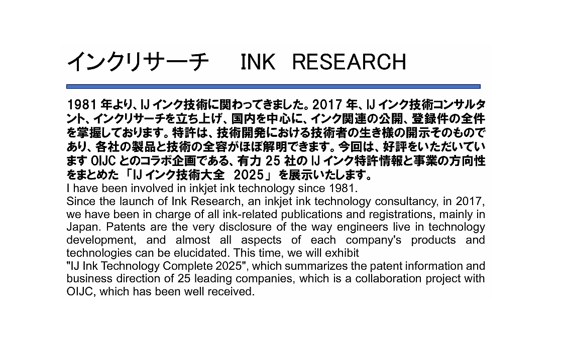 ![]() 演題:「特許からみたIJ産業用応用展開のインク技術動向2025」 今後の飛躍が期待できる産業分野への展開について,デバイス、捺染、情報/機能、立体形成の4分野に分け、そのインク技術動向を報告する。直近の5年間の公開/登録件と権利継続中の登録件を合わせた、合計2000件以上について、解析。各分野の特許について、詳細な展開技術項目の提示と注力企業リストを開示する。 小池 祥司 Shoji Koike インクリサーチ 代表 詳細はここをクリック Click to see the detail |
