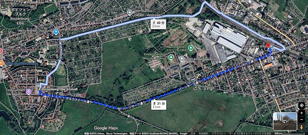 とはいえ 2.3km、31分というのは結構ありますねえ!町を出て暫くは森の中を歩きます。1990年にクルマでよく通ったのですが、ラートハウスのある方は「Boizenburg(Stadt)」、駅の近くは「Boizenburg(Bahnhof)」と二つの集落の看板があったと思います。駅の近くの白い大きな建物は「タイル(Fliesen)工場」です。まあ、産業が残ってよかったですね。