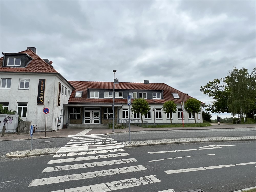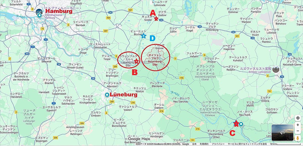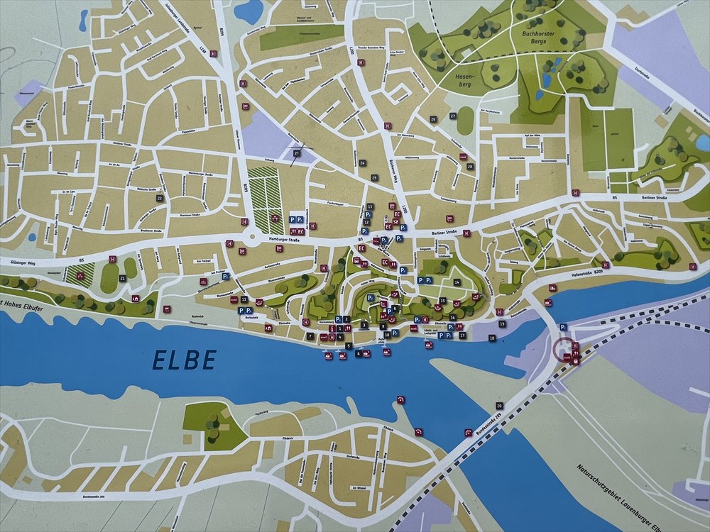 拡大図でみると、リューネブルクから来てまずエルベ川に架かる大きな橋を渡ります。ここからは川沿いの旧市街や造船所が見えます。そこを通り過ぎて駅前を過ぎると、右の方から来る運河に架かる小さい橋を渡ります。次に右にほぼ直角に曲がってそのまま行くと三叉路にぶつかり、そこを右に行くとボイツェンブルクに行くことになります。これを左に行くとラウンエンブルクなのです。