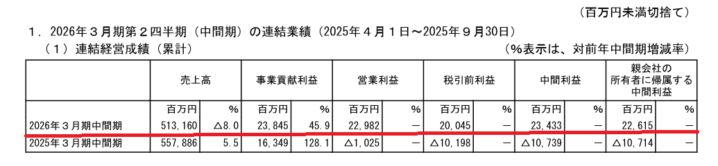 「第2四半期までに黒字転換を果たされたことは、構造改革の成果として一定の評価に値します。一方で、当期利益226億円の多くが資産売却益や構造改革費用の剥落による一過性要因である点を踏まえ、今後は事業そのものの収益力回復が問われる段階にあると考えます。