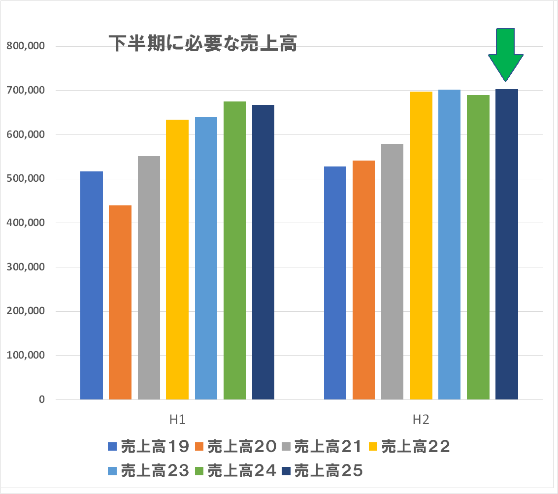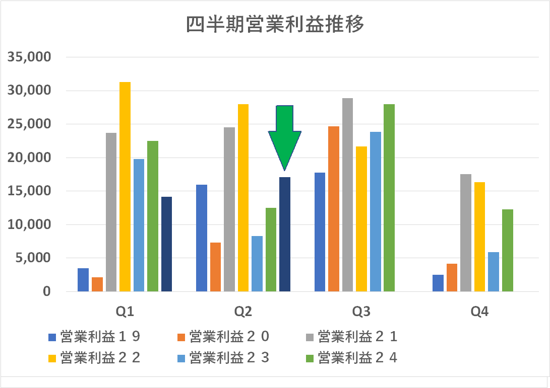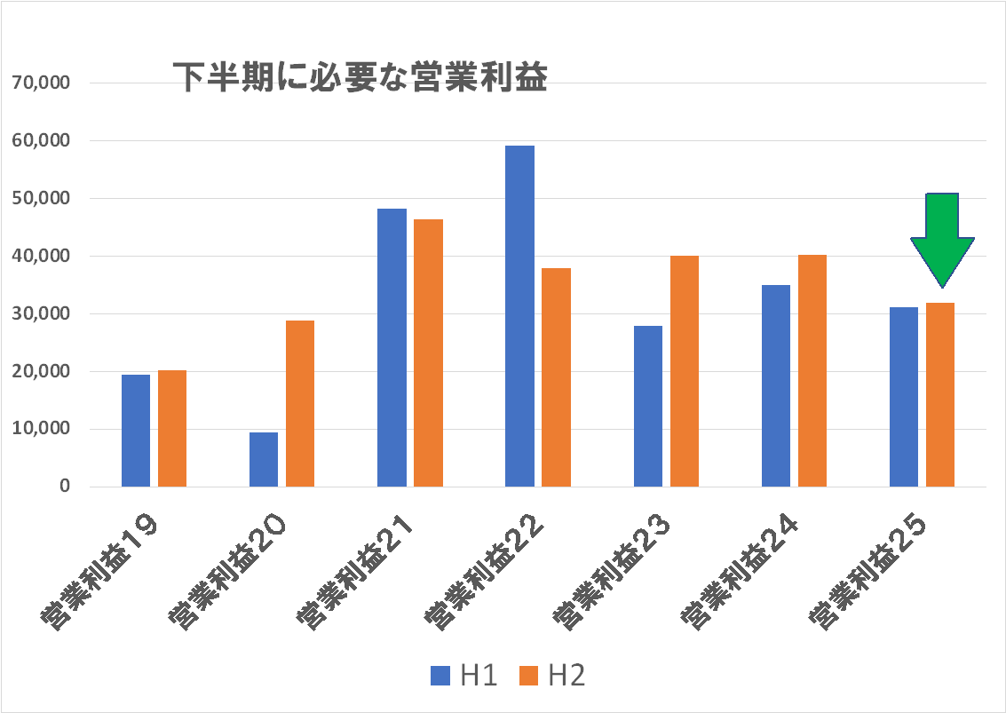 いろいろなパターンのグラフを先に一気に掲示しました。要は、売上高は僅か上方修正したものの実質的には横ばいの年間見通しに対して、下半期に作らなければならない売上高・営業利益とも全く無理をしている気配がありません=楽々達成するでしょう。要は、独断の背伸びやチャレンジをしているようには見受けられず、結果として超過達成する姿を見せたいという意図と想像されます。