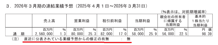 会社計画(FY2025):売上高2兆5,600億円、営業利益800億円(前年比+25.3%)、営業益率3.1%。見通し自体は「変更なし」。