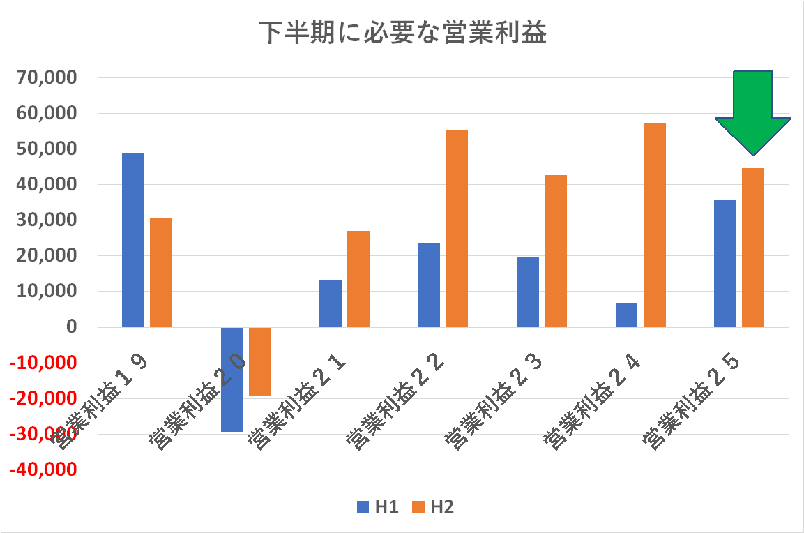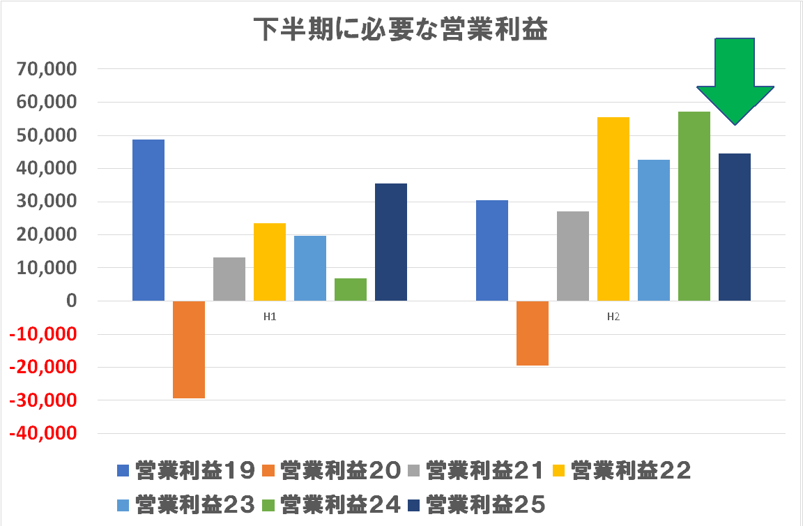 年初の見通しを据え置いた年間の売上高・営業利益を達成するために下期に必要な売上高・営業利益の数字は上のグラフの通りです。売上高は少し背伸びした感じはありますが、営業利益に関して名コンサバな数字に見えます。まあ、まだ関税リスクなどもあり、少し硬めに見ているのでしょう。営業利益は達成すると思います。まあ、リコーはこういう数字造りであまり小細工をしないというのが一貫した印象です。