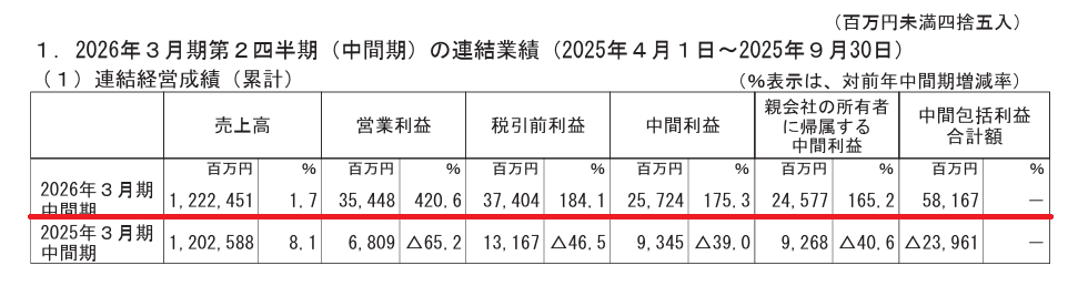 全社H1サマリー:売上高1兆2,224億円(+1.7%)、営業利益354億円(前年68億円→+420%)、営業利益率2.9%。