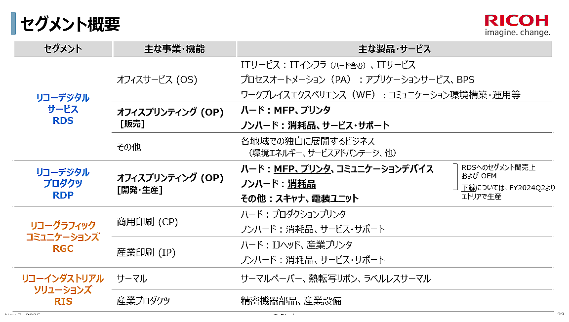オフィスプリンティング(OP):ハードは日本が牽引、欧米は景況・米国関税政策の影響で足踏み。ノンハードは欧州が弱含み。増益要因はOSでOPの弱さや関税のマイナスを吸収