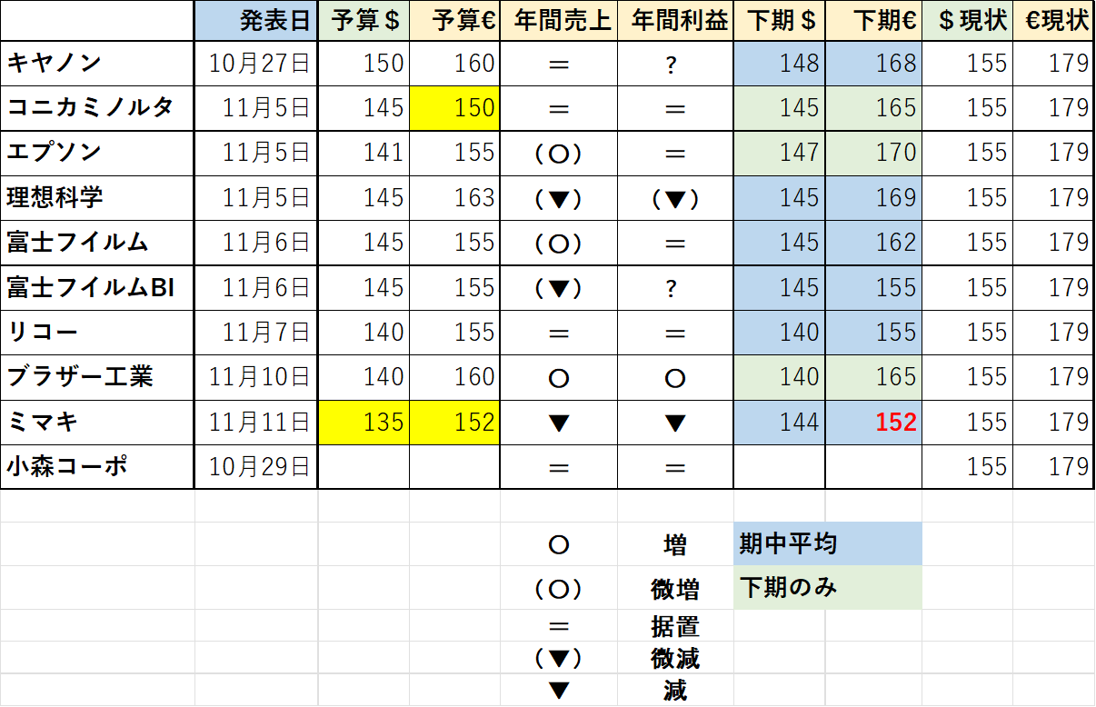 年間見通しに関しては殆どが実質的に据え置き(ブラザーが上方修正・ミマキが下方修正)に見えますが、各社とも下期の為替を実勢に比してかなりコンサバに見ているので、結果としては皆クリアするのでしょう。ミマキも前年実績を割るという見通しを発表していますが、これも為替前提をもう少し現実に近くすればそこまで下方修正をする必要は無いのではないかと見えます。トランプ関税など、まだ不安要因があるので慎重ですが、各社ともなんとか年初見通しくらいは行くのではないかと思えます。