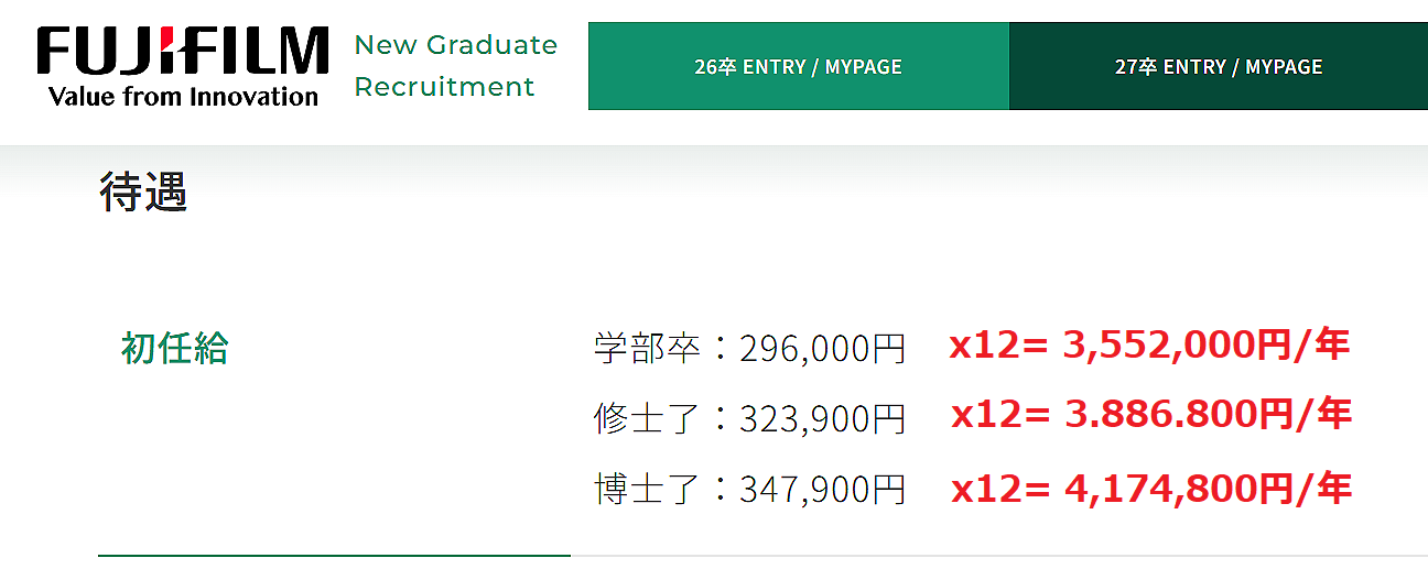 富士フイルムという日本が世界に誇る優良会社の新卒給与は下記の通りです