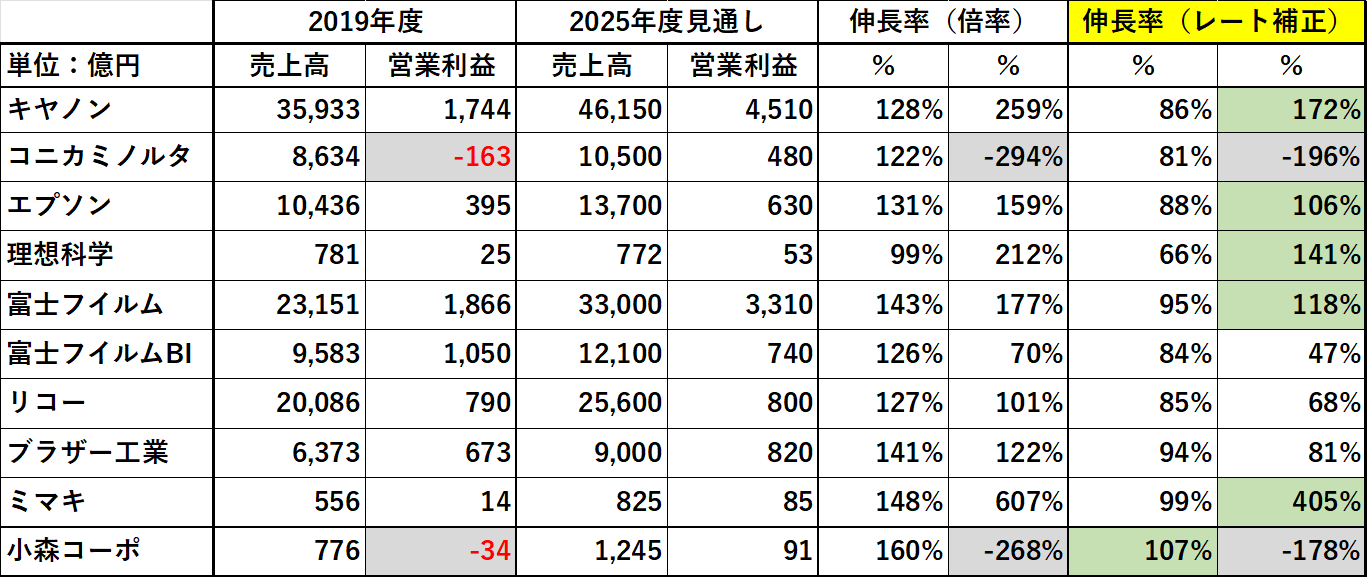 上の表は「コロナ前の 2019年度」と「今年度 2025年度」の売上高・営業利益を纏めたものです。殆どの会社は「円表示では伸びている」ように見えますが、この5年でドルが1.5倍強くなったことで補正をすると(要はドル表示すると)売上高はほぼ全滅=小森以外は 100%を割っている=シュリンクしているのです。営業利益も(2019年に赤字だったところを含め半分が 100%割れです。