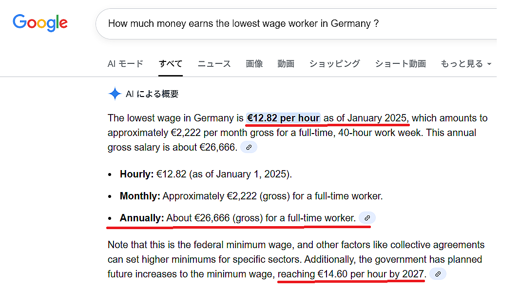 ドイツの最低賃金労働者・・・まあ、ホワイトカラー従業員は最低賃金で働く人はまずいないのでもっと高いですが・・・工場のラインの組立工とか、フォークリフトなどの免許を持っていない現場労働者(資格をもっていると最低賃金では雇えない)などが想定されますが、その年収は €26,666.-=4,773,214円(€1=179円)なんです!