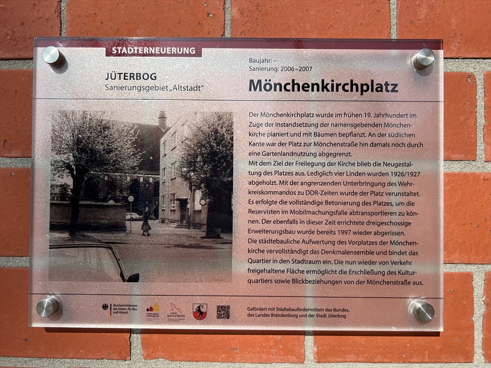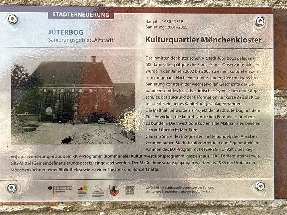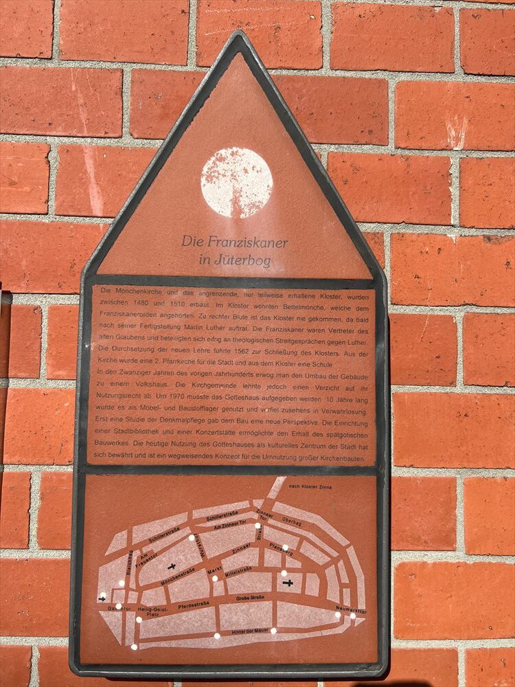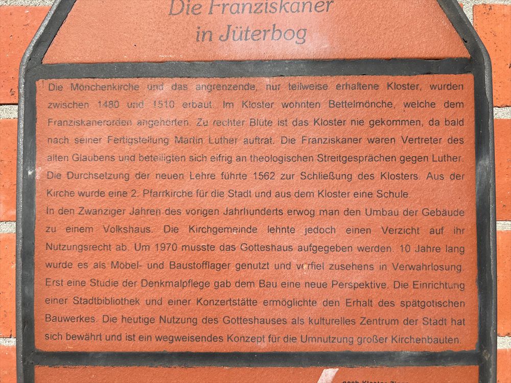 大ぶりのホール教会風の建物はかつてのフランシスコ会の修道院のようです。プレートには「ユターボグの歴史的な旧市街の中心部に位置する、500年の歴史を持つ後期ゴシック様式のフランシスコ会修道院は、2002年から 2005年にかけて文化センターに改装されました。包括的な、歴史的建造物としての改修工事の後、この建物群は(市立のギムナジウムや市民学校などとして)波乱に満ちた歴史を経て、宗教改革のために短期間しか修道院として使われなかったものの、新たな章を開くこととなりました。この事業は、ユターボグの文化史的な可能性を統合することを目的として、ユターボグ市によるプロジェクトとして開発されました。すべての工事への投資額は 800 万ユーロ以上にのぼりました。