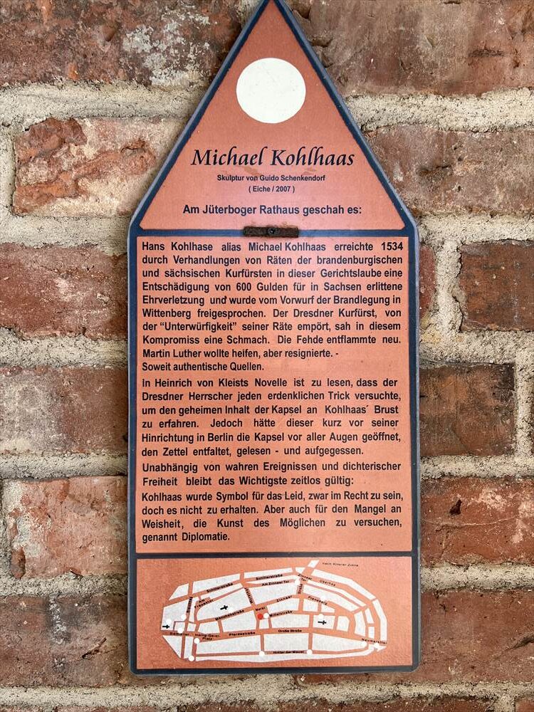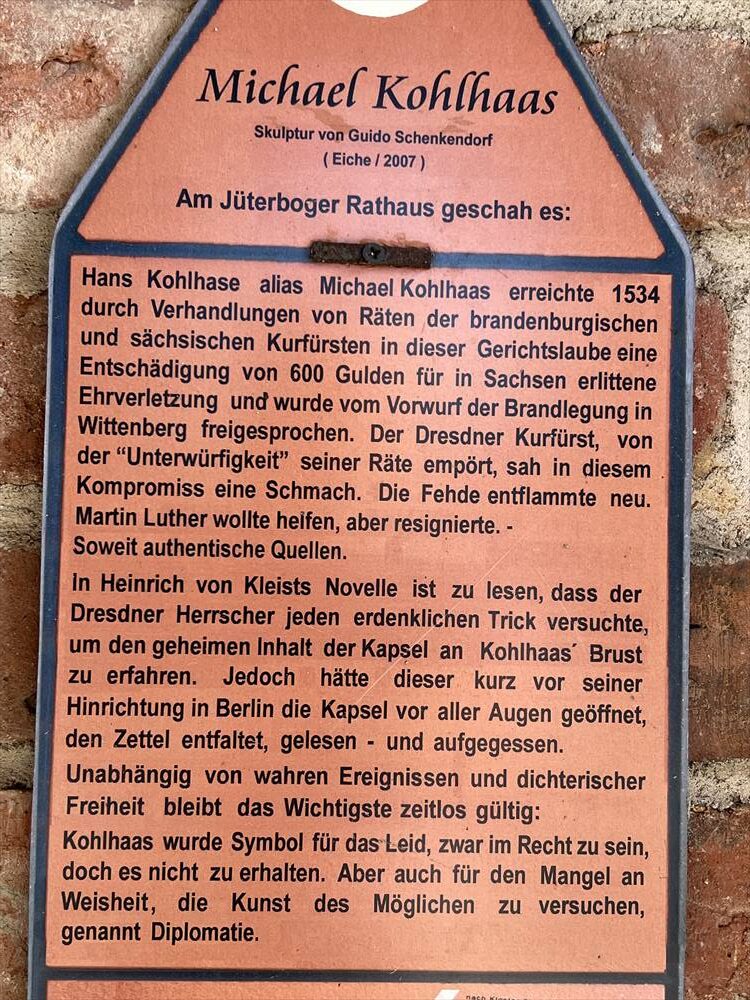1534年、ブランデンブルクとザクセンの選帝侯の評議員たちの交渉により、ハンス・コールハース、別名ミヒャエル・コールハースは、ザクセンで受けた名誉毀損に対する600グルデンの賠償金をこの法廷で獲得し、ヴィッテンベルクでの放火の容疑から無罪となりました。ドレスデン選帝侯は、評議員たちの「卑屈さ」に憤慨し、この妥協を不名誉だと考えました。争いは再び激化しました。マルティン・ルターは仲裁を試みましたが、諦めました。以上が、信頼できる情報源による事実です。