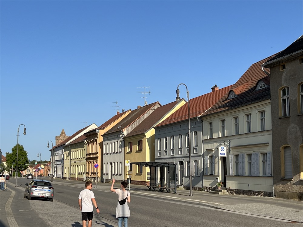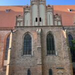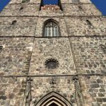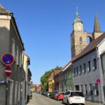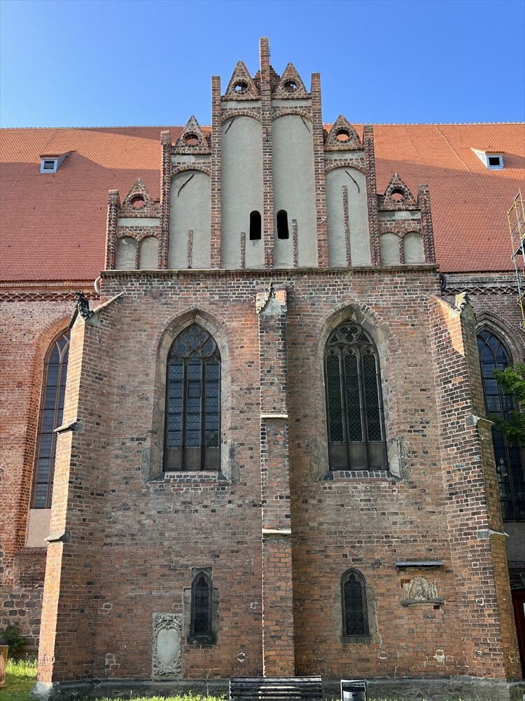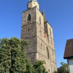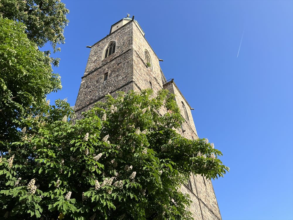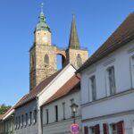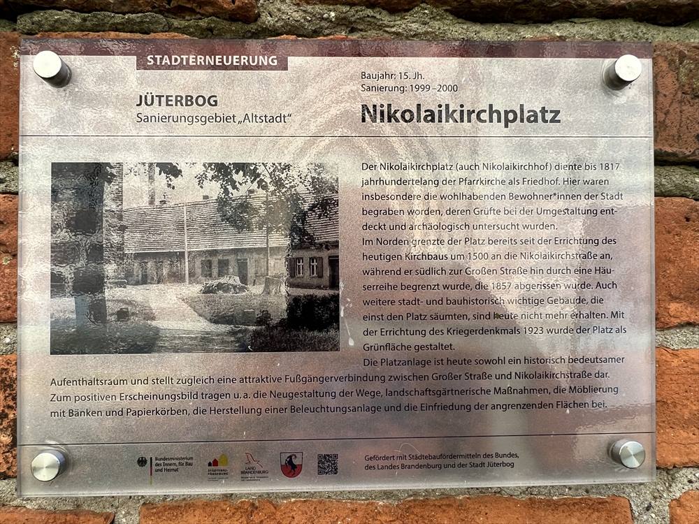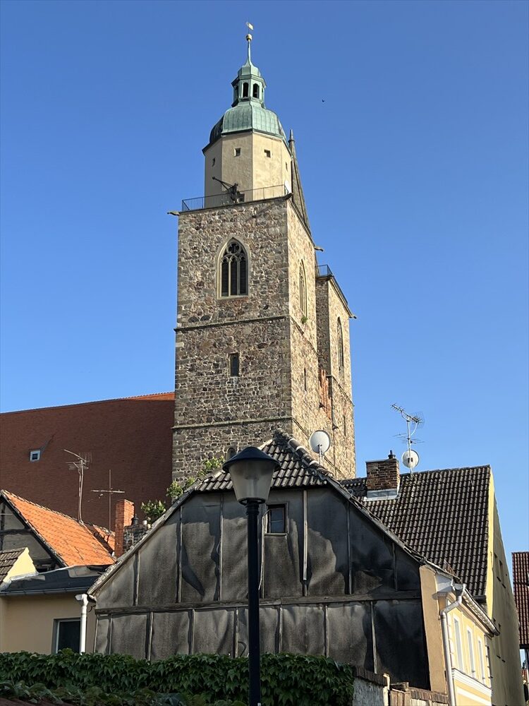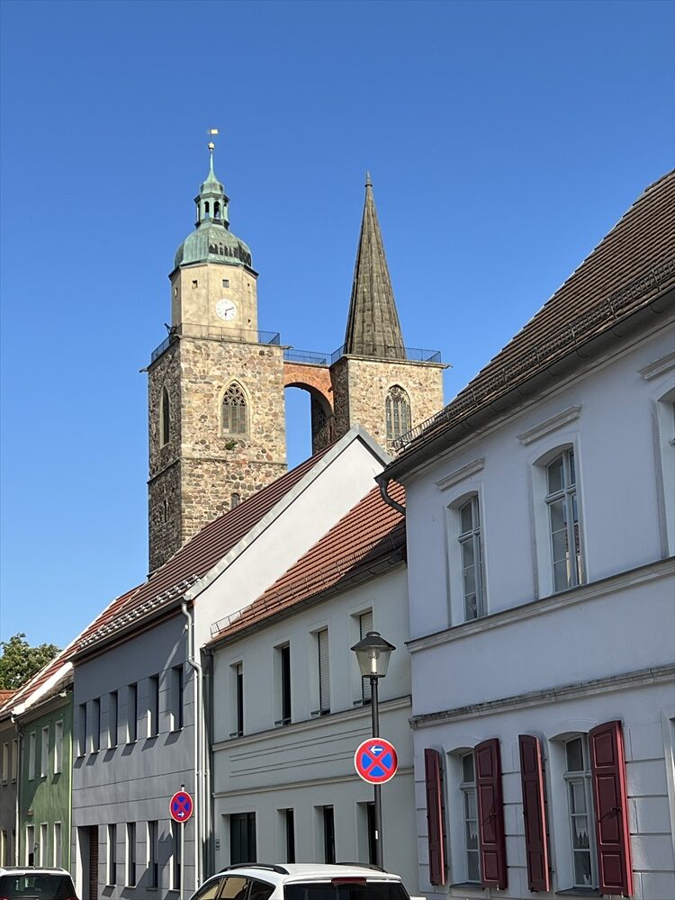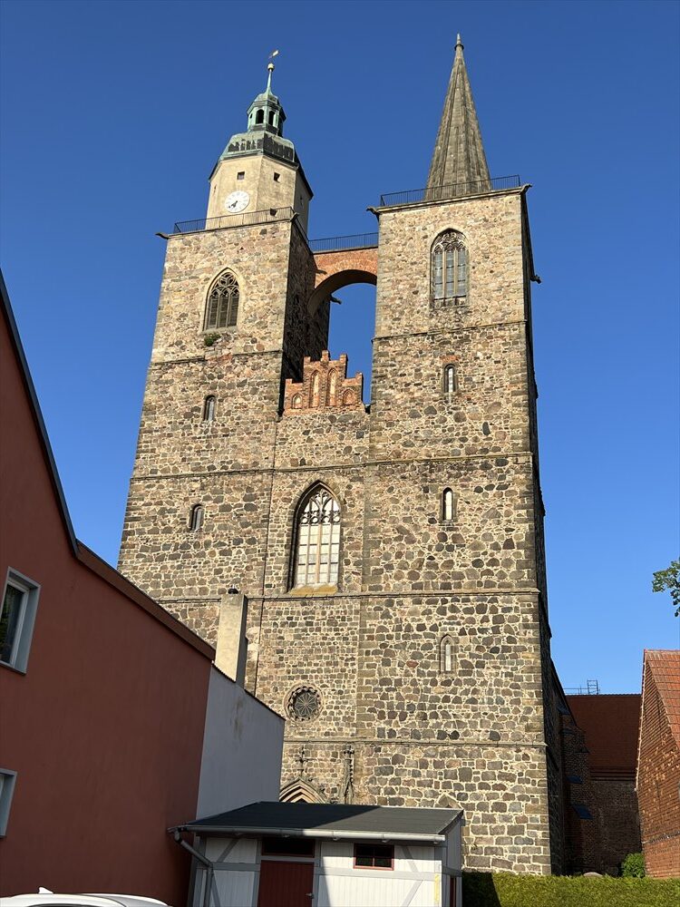 西側の 2 つの塔は 5 階建てで、上層階はより高く、大きな窓が備わっています。2 つの塔の間にはアーチ橋が架かっています。217 段の階段を上ると、北塔と南塔をつなぐアーチ橋の高さに位置する南塔の展望台に到着します。両塔の高さは 60 メートルと記載されています。北塔の頂部は 八角形で、ドームとランタンが取り付けられており、南塔の頂部は石造りの尖塔の形をしています。塔間のゴシック様式のメインポータルは砂岩で造られており、教会の守護聖人である聖ニコラウスのほぼ等身大の像を支えています。門の上には、小さなゴシック様式のバラ窓があります。このため、全体の構造は、近くのヴィッテンベルクにある聖マリア教会とよく似ています。教会の南側にある旧ニコライ墓地には、1923年に建立された兵士の記念碑があり、石造りの石棺と円柱が並んでいます。