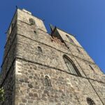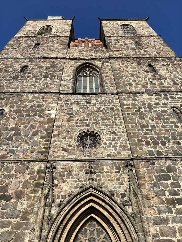 この教会は 1307 年に初めて言及されています。1221 年に奉献された聖カタリナ教会は、現在の教会の前身である可能性があります。14 世紀の終わりに、身廊は延長されました。南側の増築は 15 世紀初頭に行われました。評議員室にある碑文によると、この教会は1488年に正式に奉献されたと思われます。最初の記録から奉献までに、2つの建設段階がありました。2つの塔は、最初は別々に建設されました。身廊と西側建築物の間の隙間は、塔の建設が完了した後に埋められました。塔の建設は1500年頃に完了しました。2つの塔の頂部が異なるのは、北塔の頂部が明らかに不十分な構造であったためです。尾翼は1617年にルネサンス様式で完成しました。