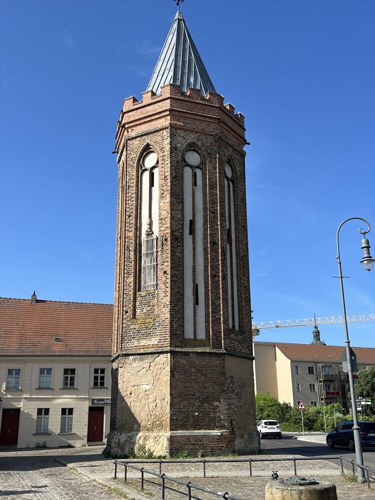 かつて大聖堂の島へと続くミューレントーア(門)の隣にあるこの珍しい塔は、建築碑文によると、1411年にシュテティンのニコラス・クラフト師によって建てられたもので、ポメラニアの後期ゴシック様式が導入された例です。城壁への接続は西側、門へと続く扉は北東側に見られます。元々は正方形の土台は、角に突起があり、八角形の塔身へと続いています。塔身は、全周にスターガルトのトレーサリーが施されています。小さなドーム型の地下牢の上には、リブアーチ型の監視室と、狭間のある 2 つの防衛階があります。中世の遺跡から、19 世紀後半の大規模な改修の際に、15 世紀の様式に基づいて、城壁とピラミッド型の屋根が再建されたことがわかります。