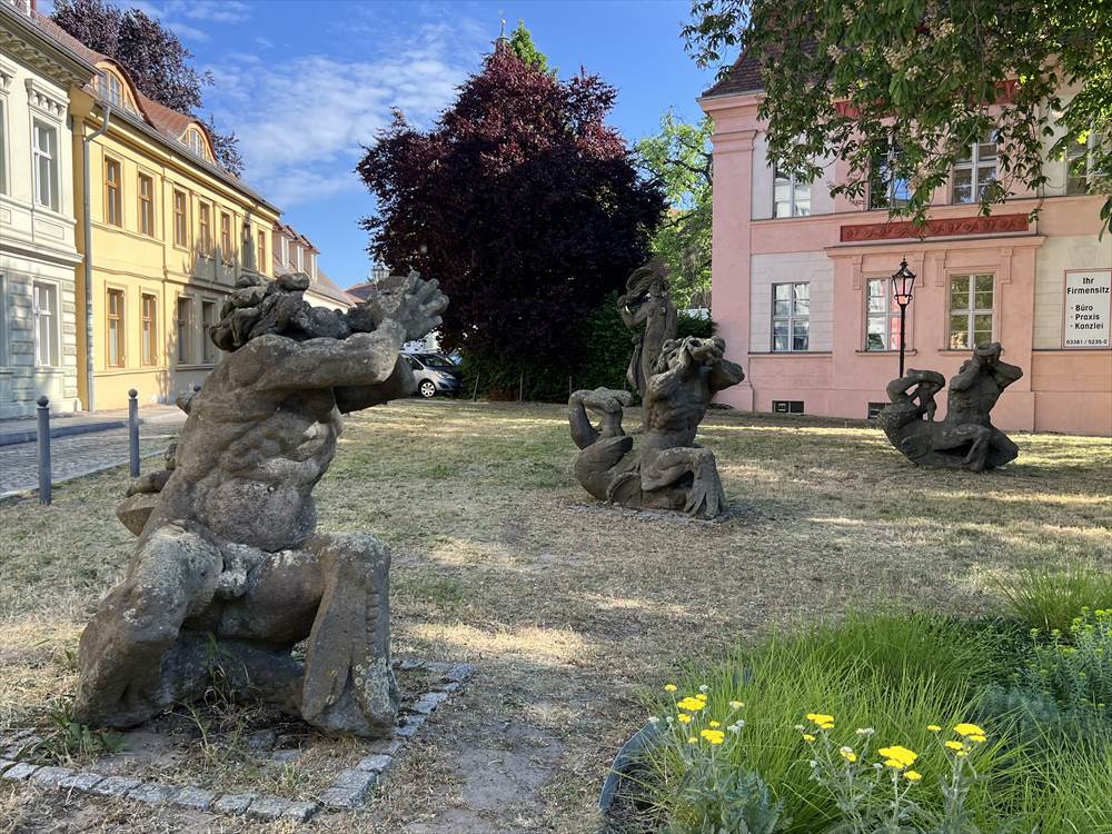 説明板には、この像群の運命について次のように書かれています。「5つの噴水像、ガラテアとトリトン群は、17世紀にイタリアの彫刻家によって制作されました。科学的に調査された素材の由来と彫刻の品質から、有名なバロック彫刻家ジャン・ロレンツォ・ベルニーニ(1598-1680)の影響が推測されます。20世紀初頭、この彫刻群は美術品取引を通じてブランデンブルク・アン・デア・ハーフェルに持ち込まれました。長年にわたり損傷したままで、ルッケンベルク橋の近くでほとんど注目されることもなく放置されていたこれらの彫刻は、ブランデンブルク・アン・デア・ハーフェル・ロータリークラブの主導と支援により、回収され、修復されました。