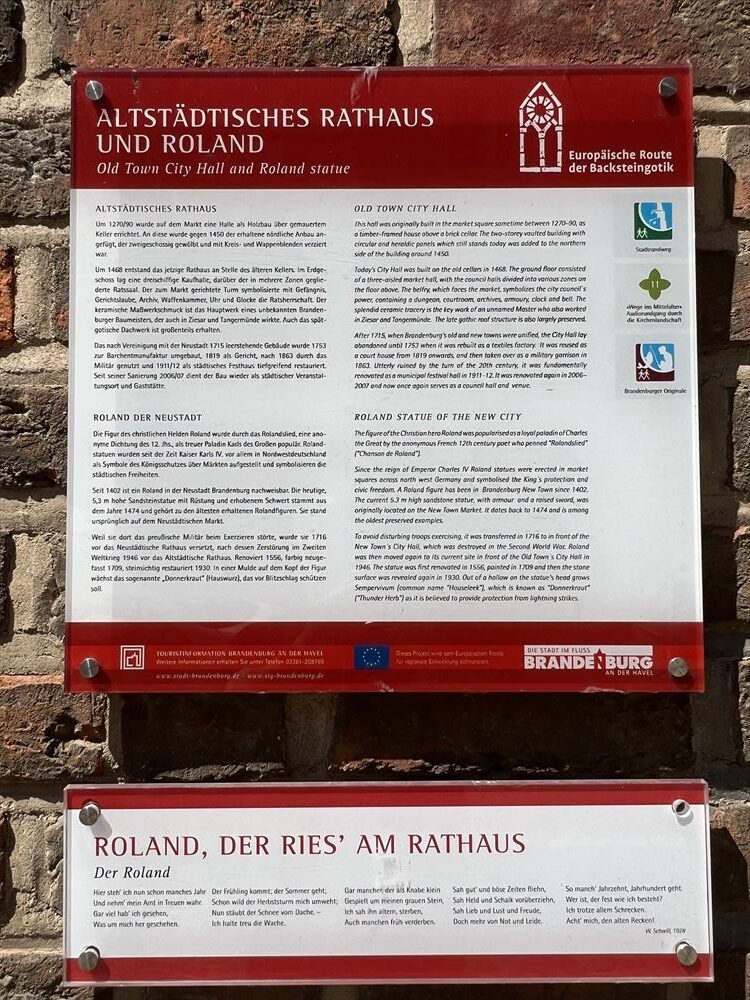 1402 年以降、ブランデンブルクの新市街にローランド像が存在したことが確認されています。現在の、高さ 5.3 m の砂岩製の像は、鎧を身に着け、剣を掲げており、1474 年の作で、現存する最古のローランド像のひとつです。この像は、もともと新市街の市場に立っていました。