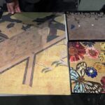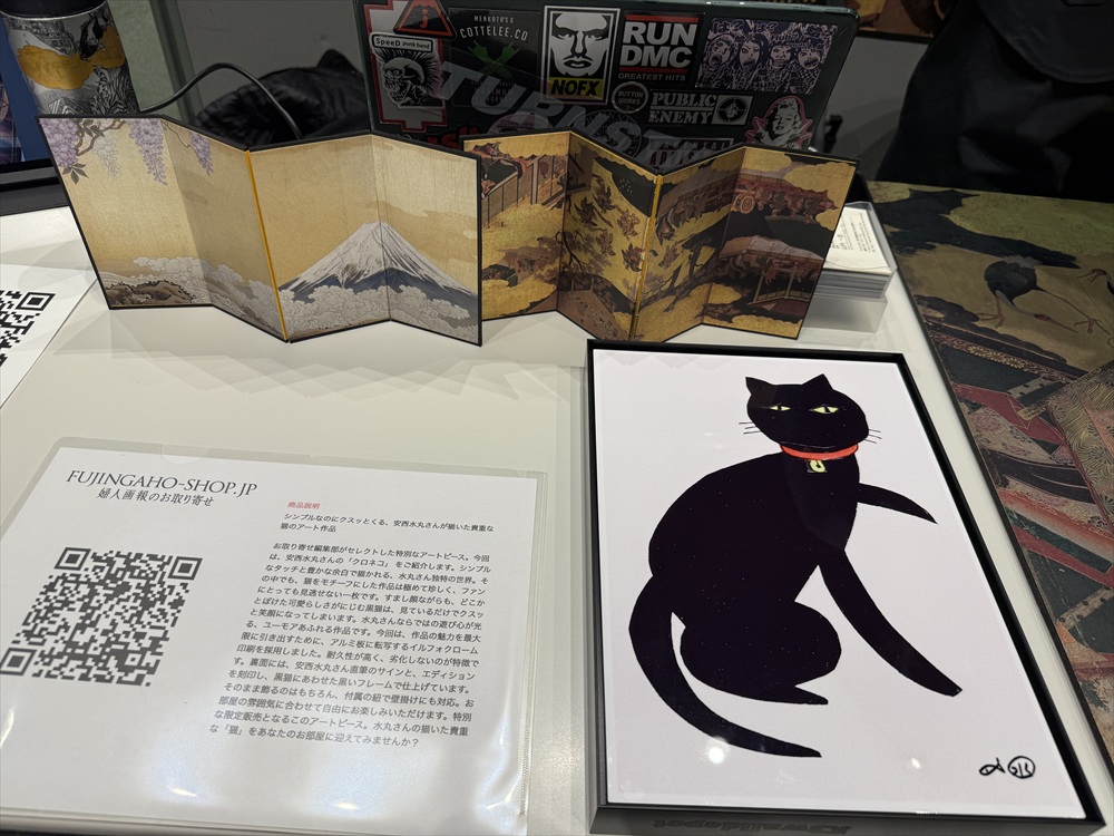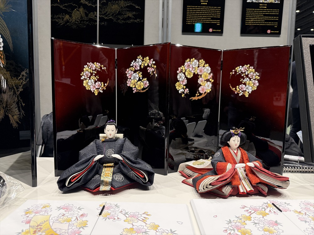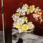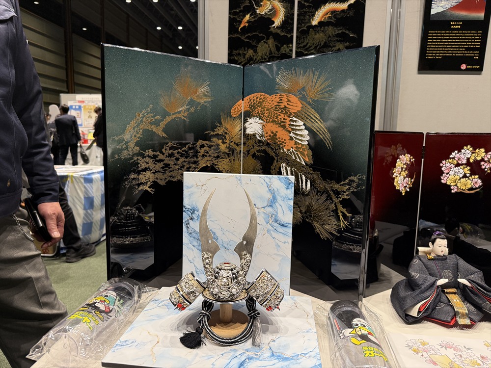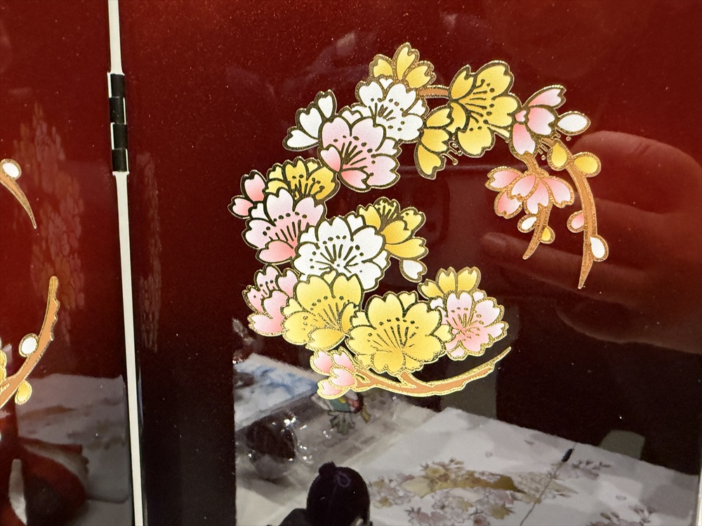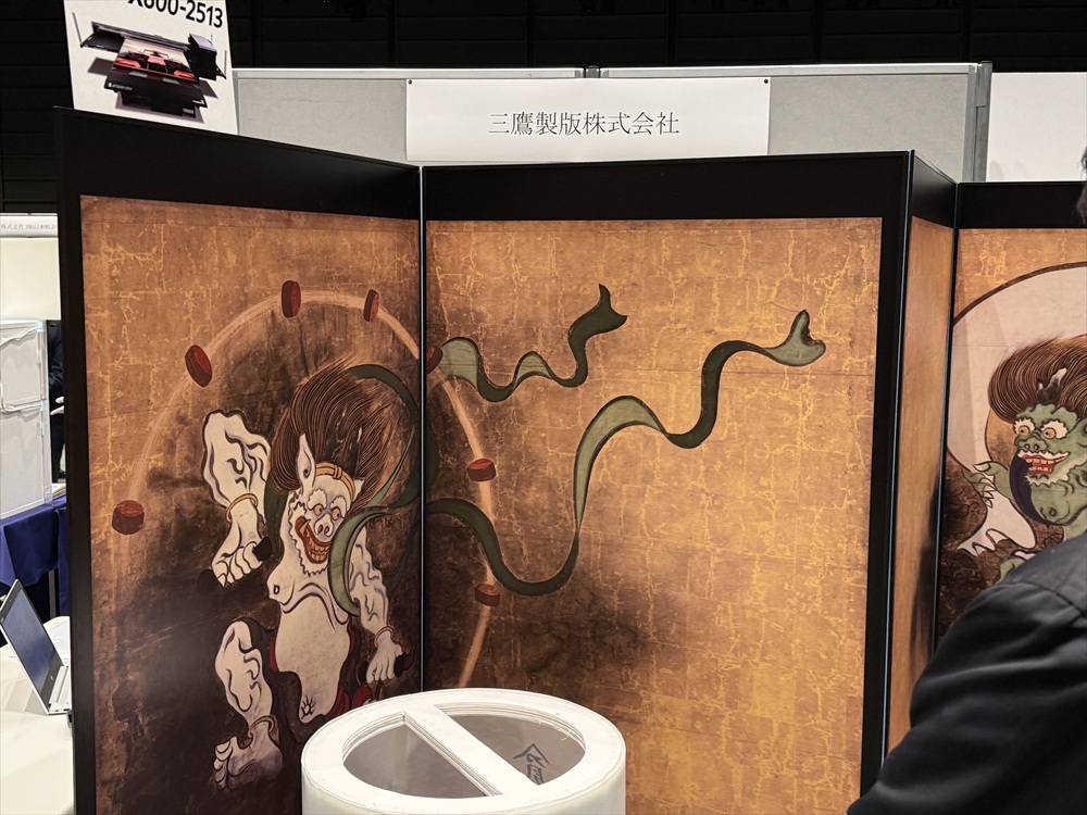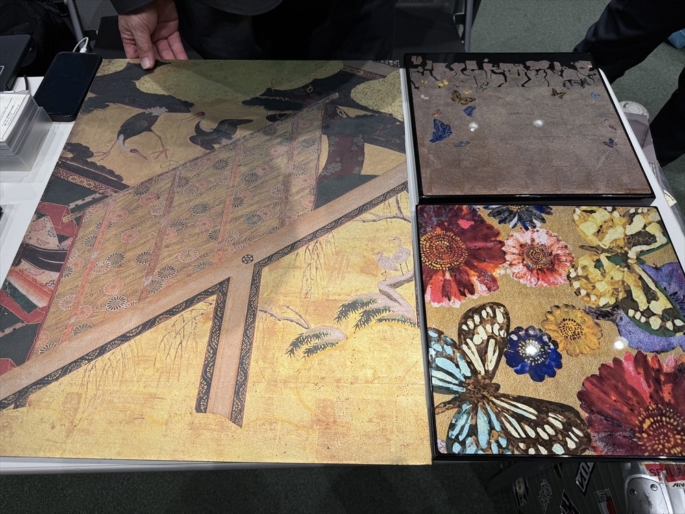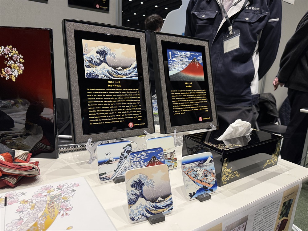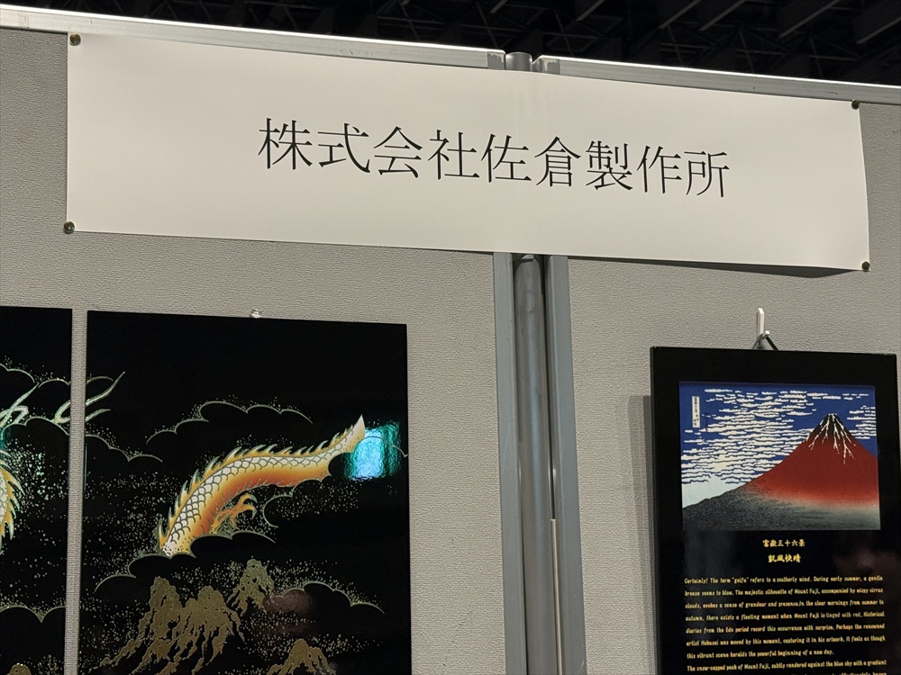 【佐倉製作所】地名人形の「屏風」を作っている会社で、光沢感・高級感のある屏風やプレートを作るのはお手のもの!そこにUVプリントを持ち込み、またそれを接着材として撃ってその上に箔押しをするという技法で、非常に高級感のあるアイテムを製作しています。神奈川沖浪裏や赤藤のプレートはインバウンドの海外顧客に大好評とのこと。
