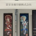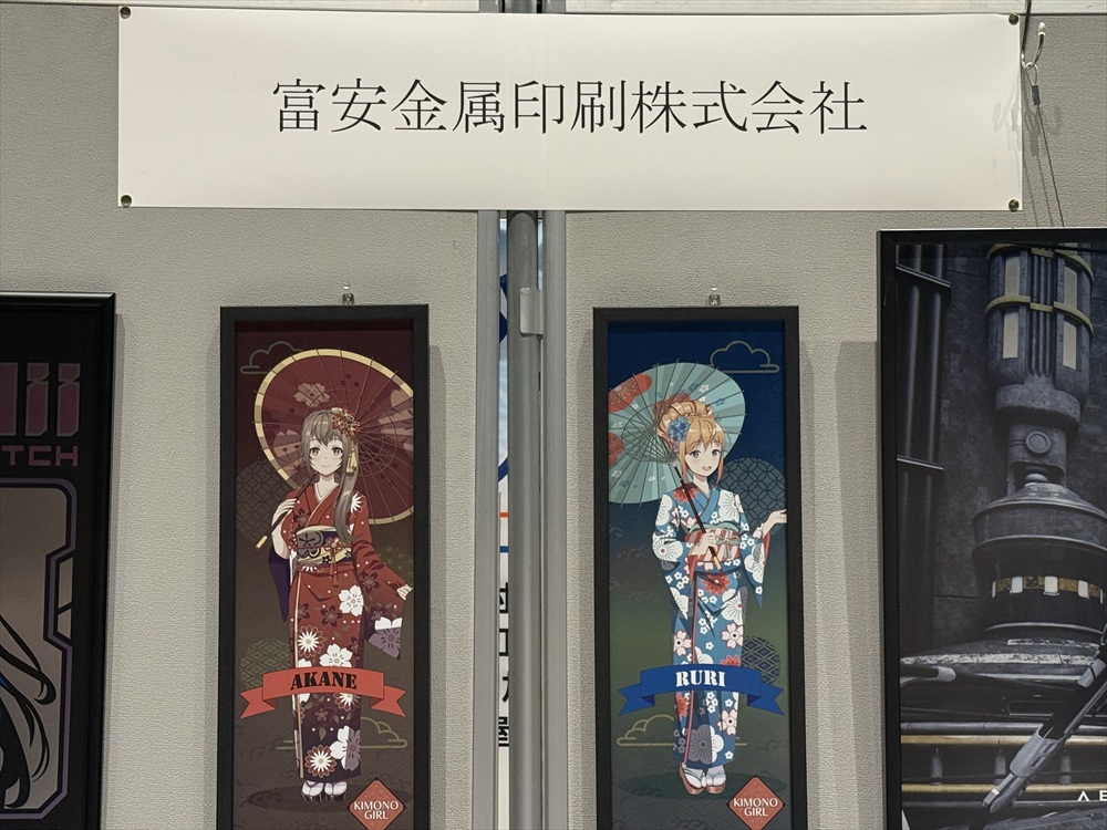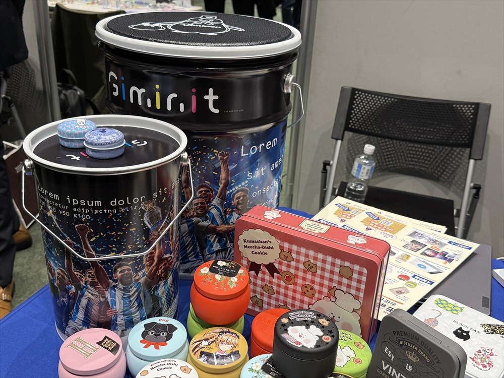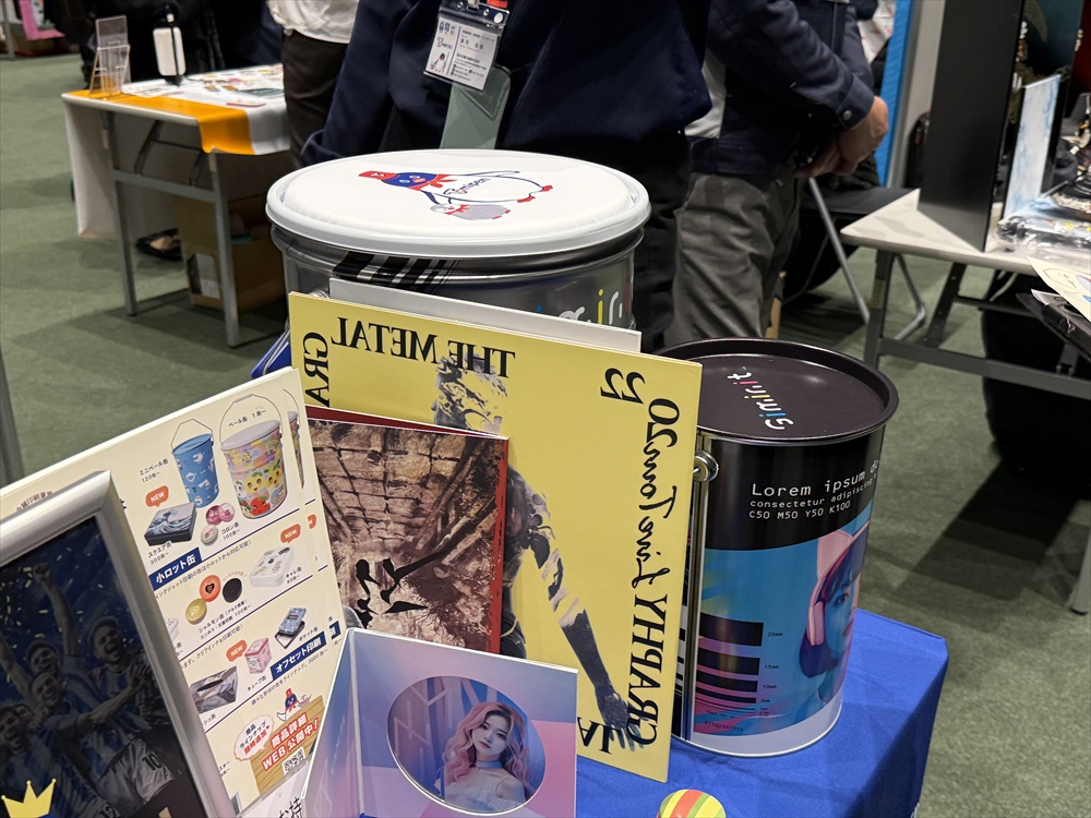 【富安金属印刷】金属へのプリントでユニークな地位を確立しつつある会社。小物入れのような缶各種、ペール缶など・・・金属にUVプリントしてから折りや曲げや絞りの加工をするので「柔らかいUVインク」がカギとのこと。最近、以前に使用していた機種からミマキに乗り換えたそうだがプリントは非常に良好とのこと。また壁には金属への装飾印刷のサンプルが掲げられており、業容も拡大中とみました。