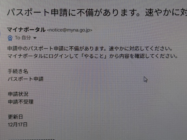 さて申請から一日経ってこんなメールが来ました。やれやれ、なんか申請内容に不備があったようです。なにが不備なのかはメールには書かれておらず、またマイナポータルにログインして、そこの「やること」コーナーを見ろ!ということのようです。別にメールに書いてくれてもいいじゃんか・・・気の利かないヤツ、というか使えないヤツ(笑)