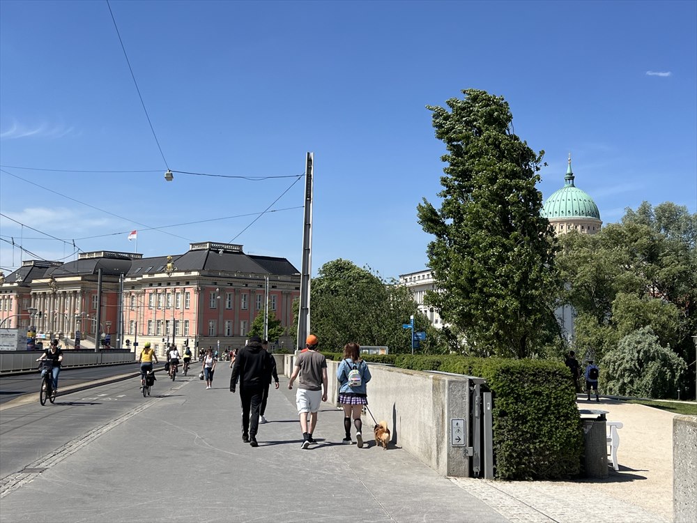 Lange Brückeを渡ります。すぐ向こうに Stadtschlossとその奥に St.Nikokaikircheが見えています。ポツダムを象徴する建物です。St.Nikolaiは商業や交易の守護神とされ、かつては河川や港湾を中心とした交易が重要だったという背景から St.Nikolaiはそういう水辺に建てられたという経緯があります。