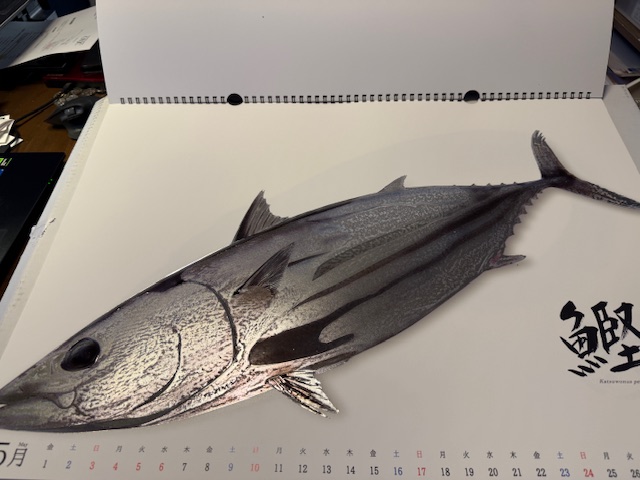 今年も頂きました!佐川印刷の「えひめの魚カレンダー」!このカレンダーは毎年少しずつ新たな技法を開発したり取り入れたりして進化していくのが凄いところです。最初は魚の艶のある部分とそうでない部分を光沢感で塗分けているのがウリしたが、その後、アルミホイルを使って魚のキラキラした感じを出すのに成功しました。