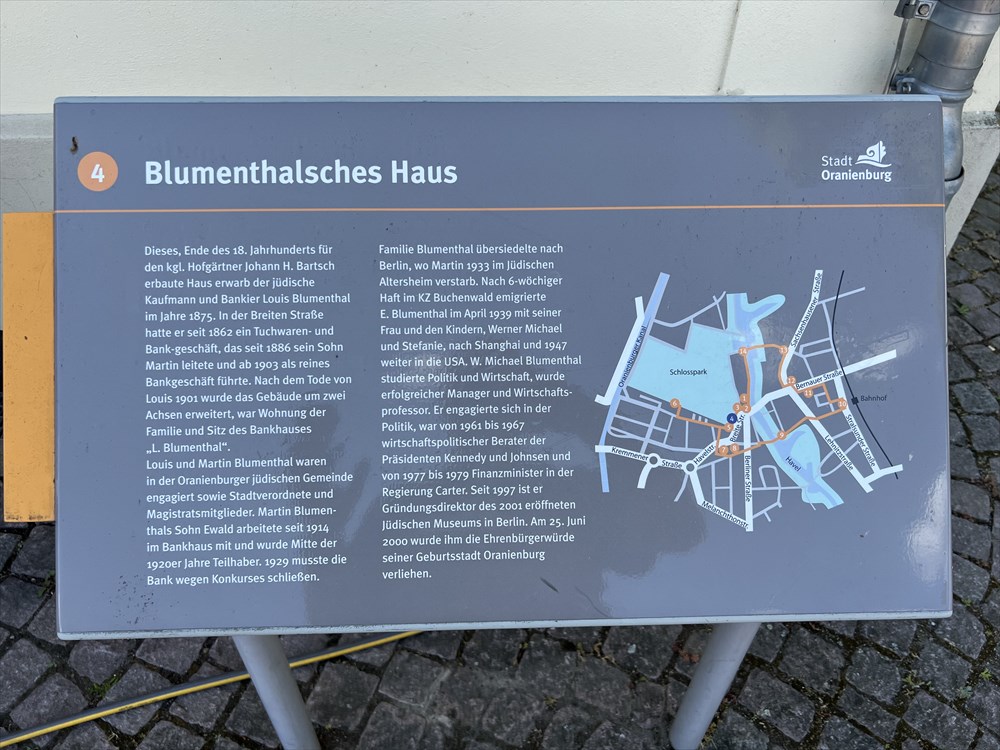 1700年頃に拡張され、オラニエンブルクで最も重要な初期バロック様式の建築物となっている。この建物の真の見どころは、城と行政長官の庭園に面した裏側にある、2つの楕円形のガーデンルーム、精巧な漆喰の天井、そして印象的な中央の突起部分だ。城と孤児院を結ぶバロック様式の視線の軸上には、行政長官の邸宅と、ブライテン通りにあるブルメンタール邸が、重要な建築的要素となっている。