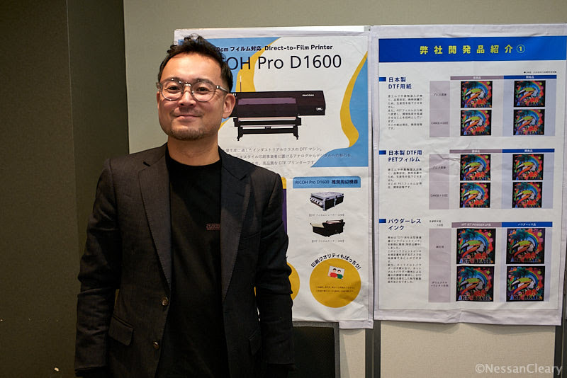 現時点では開発段階にあり、松井によれば耐洗濯性はまだ十分ではないという。「洗濯堅牢度は粉末インクより劣るが、デザインや顧客次第だ」と彼は説明する。15~20回の洗濯には耐えられる。一部のDtF(ダイレクト・トゥ・ファブリック)印刷ではそれで十分だから、顧客次第だ」