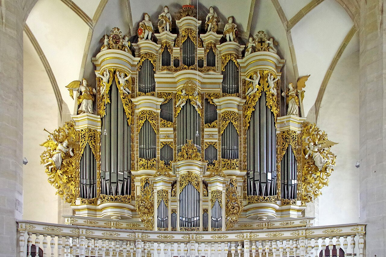 1665年から1666年にかけて、無名のオルガン製造者が新しい楽器を製作し、1674年にクリストフ・ユンゲがそれを拡張しました。1693年から1705年にかけて、ザカリアス・タイスナーが大幅な拡張改造を行い、古い部品を使用して現在の豪華なプロスペクトを作り上げました。タイスナーの作品は41のレジスタで構成されていましたが、品質は満足のいくものではなく、未完成のまま残されました。ヨハン・フリードリッヒ・ヴェンダー(1714年から1717年)の時代に、ようやくこのオルガンは完成しました。ヴェンダーは、新しい風箱と 6 つの新しいベローズを製作しました。彼はまず 50 のレジスタに拡張し、第 2 段階の工事では、追加の胸部楽器を 66 のレジスタに拡張しました。メルゼブルクのオルガン製造者ヨハン・ゴットフリート・クルグは、1780 年に、オルガンの最上部と背面にスウェルボックスを取り付けて、上部楽器を補完しました。この箱は、演奏台からワイヤーで扉を開閉することができ、その中に「エコー」という音域を設置しました。バックポジティブには、下層ギャラリーから演奏できる、1つのマニュアルを備えた小さな2番目の演奏台が設置されました。しかし、このオルガンは修理が必要になることが多かったため、1843年から1847年にかけて、さまざまな改造計画が立案されました。
