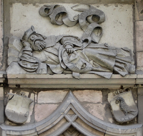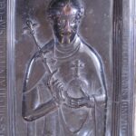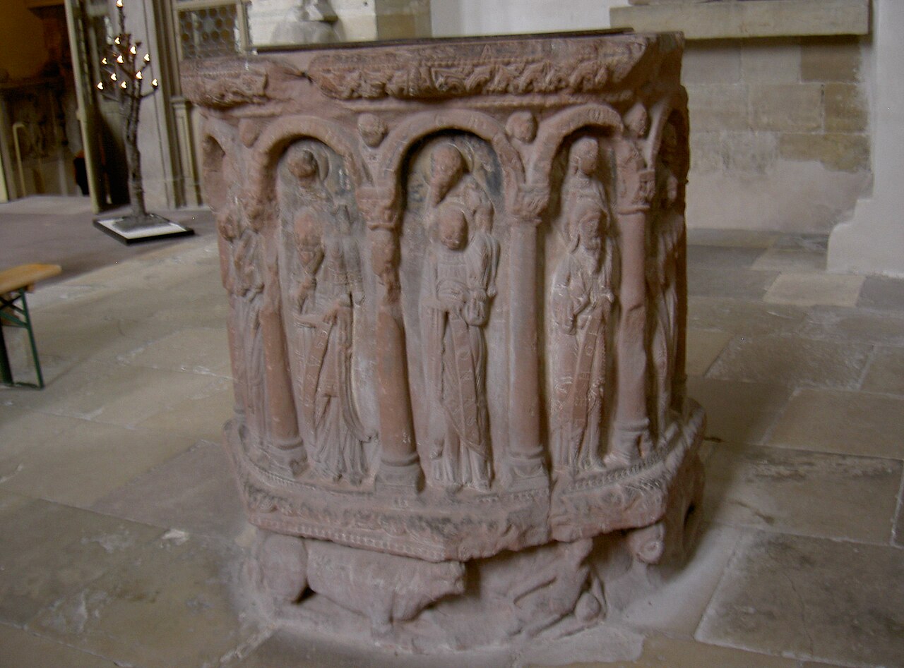 南側横廊、王侯の墓所入口の前には、もう一つの洗礼盤があります。杯の形をした砂岩製のこの洗礼盤は、1665年のものと推定されています。六角形の杯の各面には、3つから4つの彫刻が施された紋章が、合計21個刻まれており、銘文に記されている寄贈者、ザクセン=メルゼブルク公クリスティアン1世の威厳を表しています。