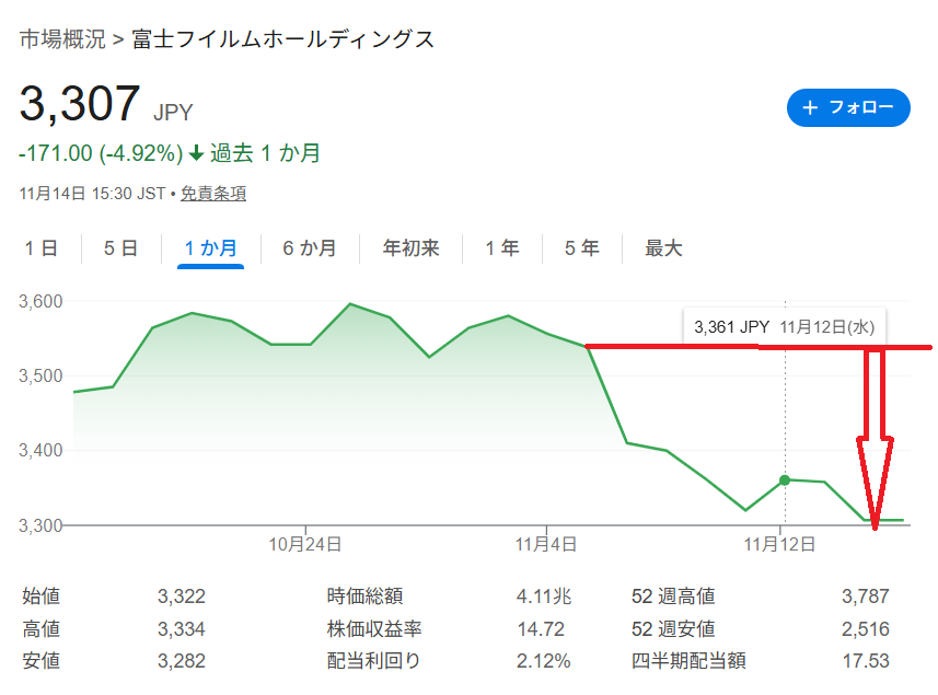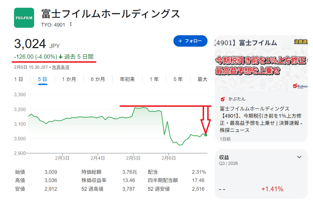 富士フイルムの株価は2025年度Q2の決算発表後に下落しました。決算自体は好決算だったと思いますが、株価は何故下落したのでしょうか?