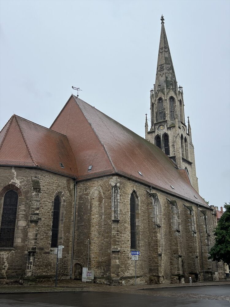 この教会は 10 世紀に設立され、1247 年に初めて文献に登場しています。現在の建物は、1432 年から 1501 年にかけて建てられた、3 身廊 4 アーチ式のホール教会で、支柱が備わっています。中央身廊と同じ幅の短い聖歌隊席は、1485 年に建てられたと碑文に記されています。碑文に関連する磔刑のレリーフは、東壁の外側にありましたが、現在は破壊されています。身廊の中央のアーチにある、後期ゴシック様式のシンプルな側面の扉は、19 世紀に壁で塞がれましたが、南側の扉は 1998 年に再び開かれました。その側面には、15 世紀半ばの像用の 2 つの仮面コンソールが取り付けられています。窓は、元のトレーサリーを失っています。身廊の軸からずれているロマネスク様式の西塔は、1867年から1872年にかけて、フリードリッヒ・アウグスト・シュトゥラーの設計による高いネオゴシック様式の塔に取って代わられました。その際、身廊は西側に1間分延長されました。この塔は、高いコーナーブレース、八角形のウィンプガーク階、そしてフランスとドイツのゴシック様式を彷彿とさせる、切り石でできた急勾配の閉じた尖塔が特徴です。1867年から1876年、1901年、1972年から1973年にかけて修復工事が行われました。