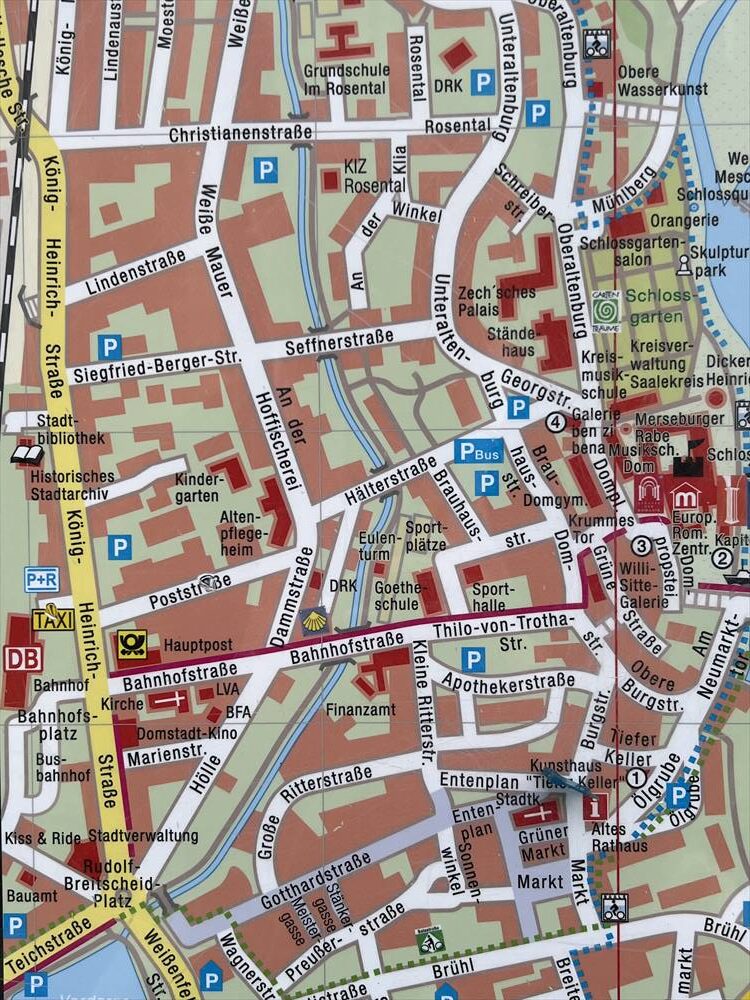 1444年の火災の後、当時のマルクト通り(現在のブルク通り)に、古い遺跡の上にメルゼブルク市庁舎が建設されました。今日、この建物は「旧市庁舎」と呼ばれています。その理由は、後に南西側、つまり斜め向かい側に市場広場が建設され、そこに「新市庁舎」が建てられたためです。しかし、新市庁舎は現在では存在していません。その後の改築により、ゴシック様式とルネサンス様式を組み合わせた市庁舎が誕生しました。この組み合わせは、ハレやアイスレーベンなどでも見られます。ここでは、通常よく見られる塔は採用されず、屋根の塔と数多くのファサードのディテールを備えた、シンプルでありながら魅力的な建物が造られました。