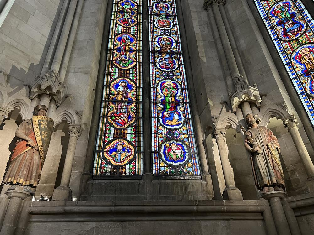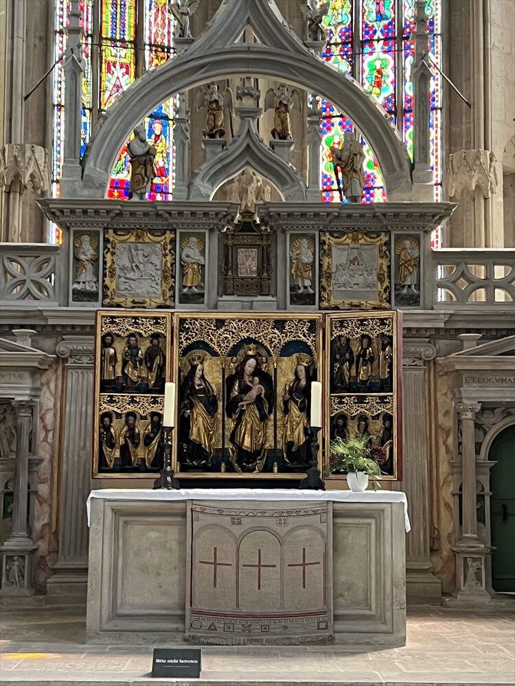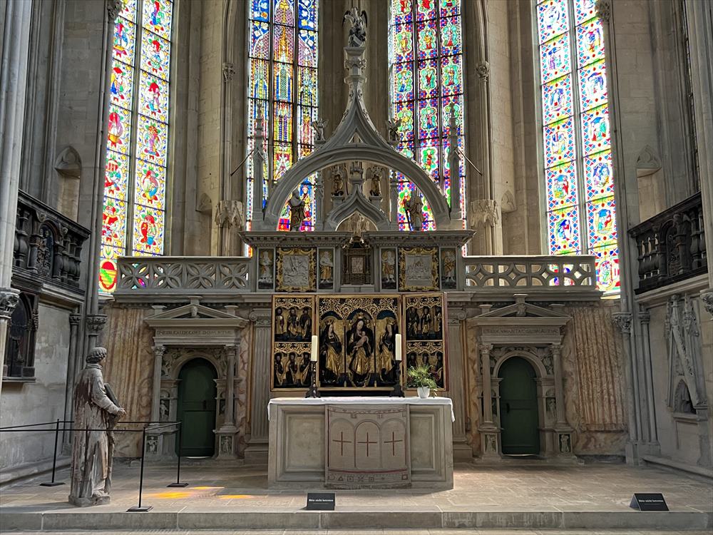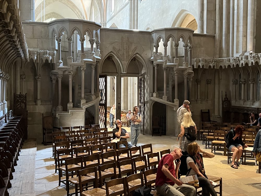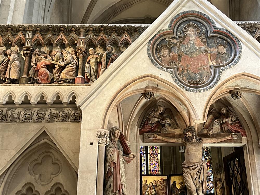 ナウムブルク大聖堂は二重聖歌隊席、つまり両側の狭い側面にそれぞれ聖歌隊席がある構造となっています。有名な西聖歌隊席は13世紀後半に建設され、西側の聖歌隊席とナウムブルク・マイスターの工房による寄贈者像とともに、初期ゴシック様式建築の最も重要な建築物のひとつとなっています。