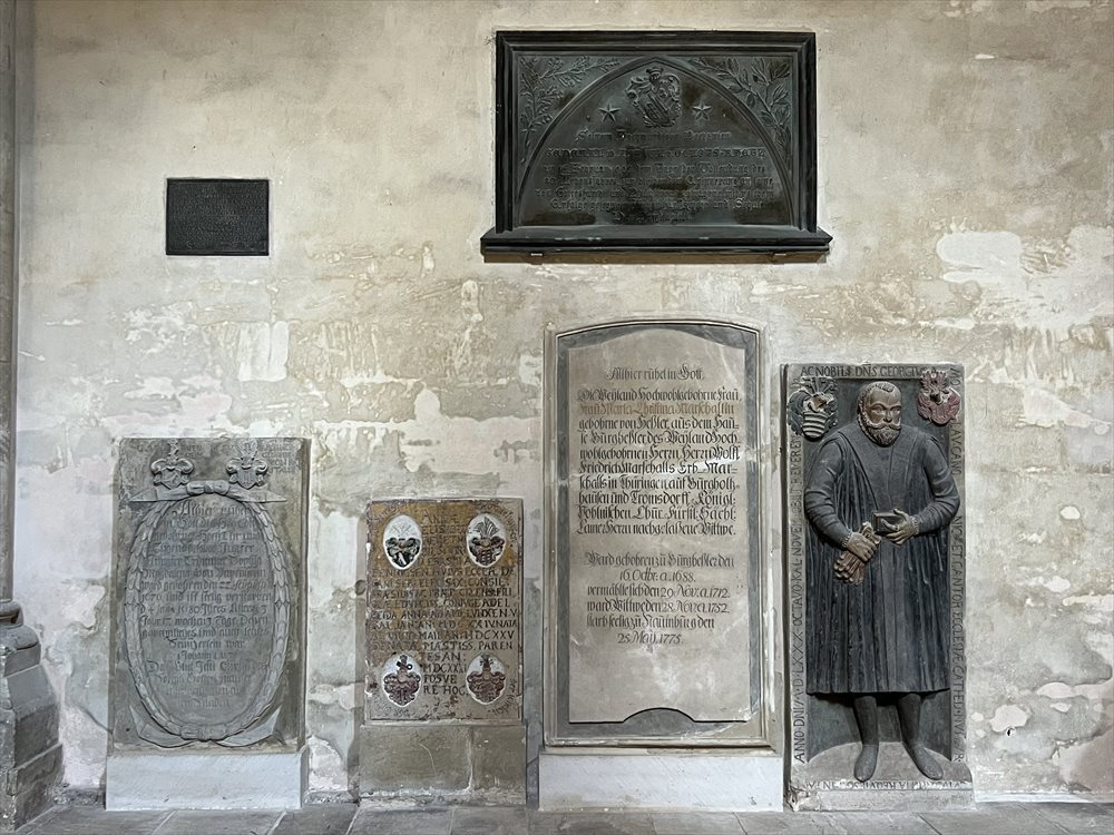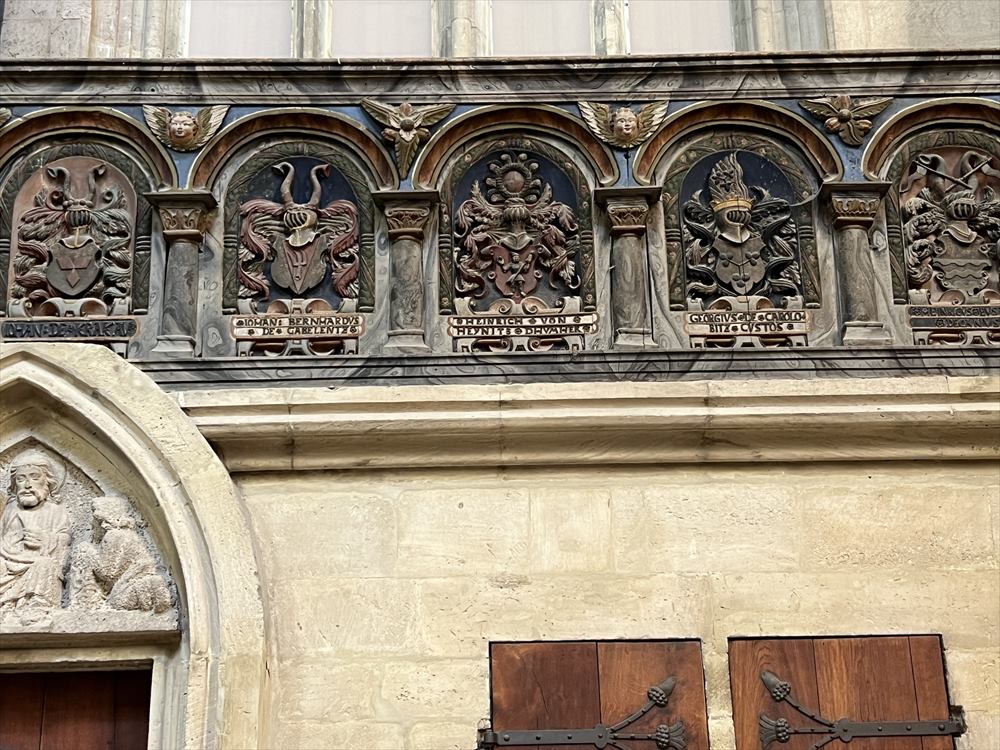 建設当時、この地を統治していた領主や寄進者たちは、西側聖歌隊席内部のアーケードのフリーズに描かれています。それは、マイセン侯爵のエッケハルト2世(盾の銘文「ECHARTVS MARCHIO」)とヘルマン兄弟、そして美術史で世界的に有名なウータとレグリンドという彼らの妻たちです。寄贈者たちの像は、その姿勢と身振りによって、柱と内部空間との間をつなぎます。
