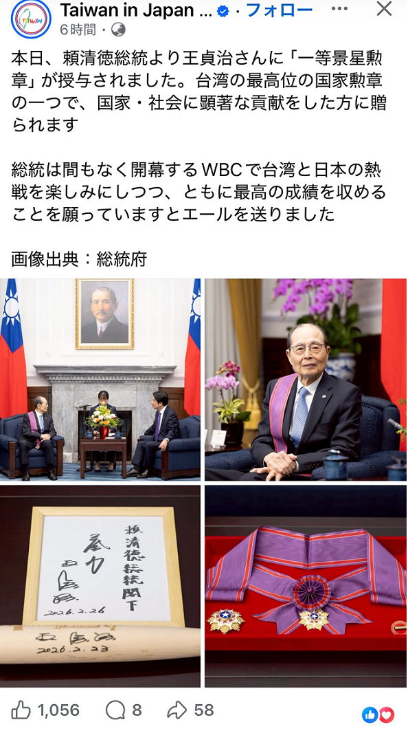 今回、食事をしていたら奥の個室から食事を終えた数名の人が出てきて私の横を通り過ぎまして・・・あれ?王貞治さんでは?と思ったのですが「まさかそんな偶然はないだろう、他人の空似に違いない。WBCも近いのにまさかね」とスルーしました。後で facebookに上のような投稿がありました。台湾政府から勲章を授与されたんですね!おめでとうございます!