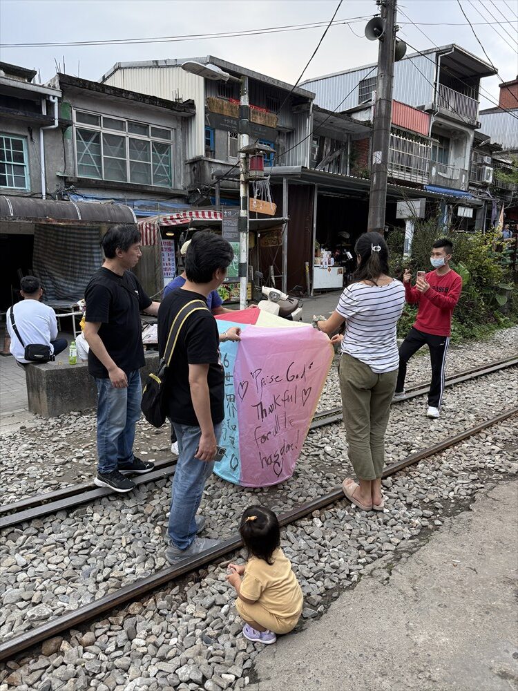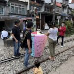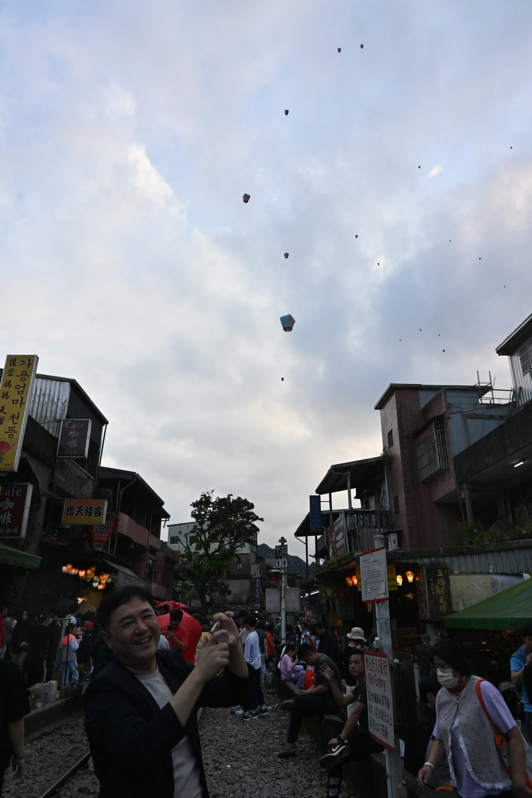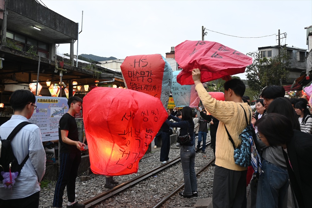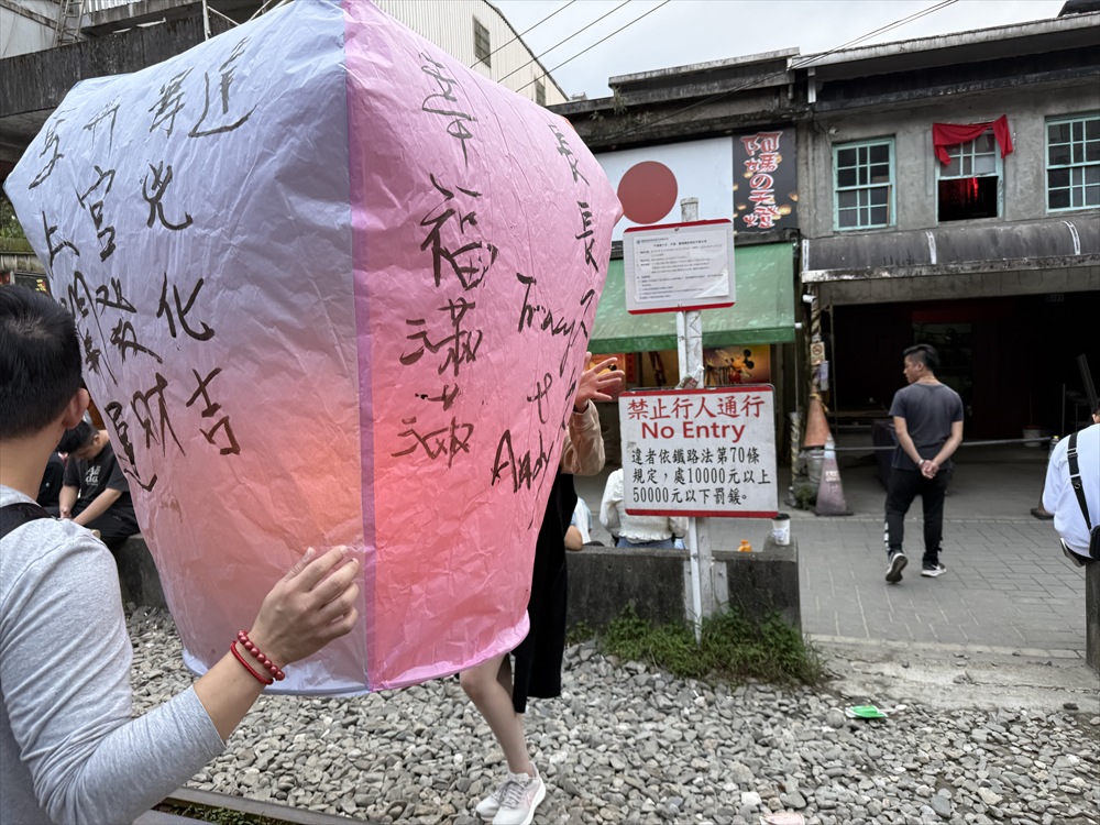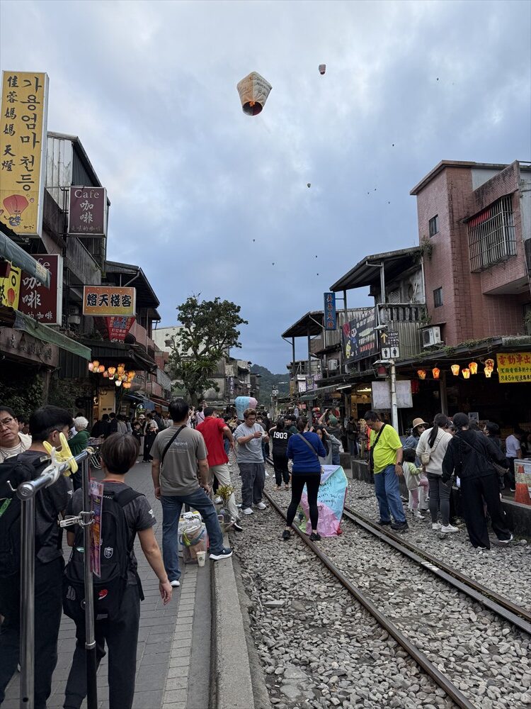 天燈を揚げる場所はれっきとした鉄道線路の中です。15分に一度くらいの割合で列車が通り、その度ごとに観光客は横の道路に撤収しますが、列車が通過するとまた中に入って天燈揚げを続けます。列車の運転手も手を振っているので、黙認して皆で楽しんでいるのでしょう。