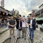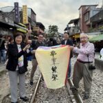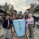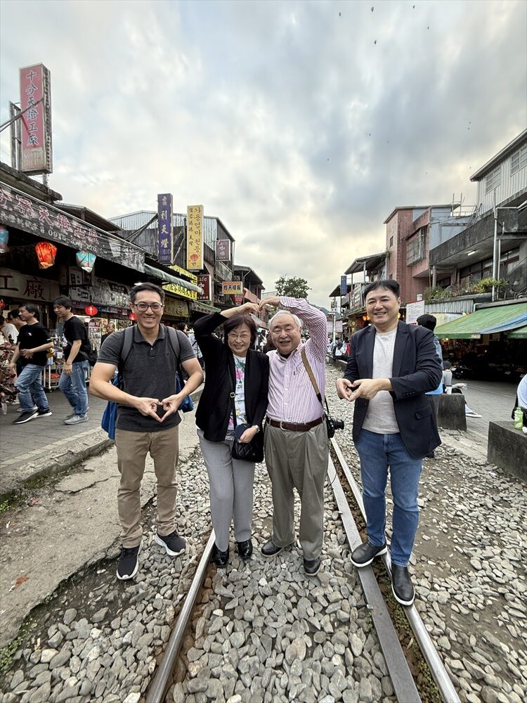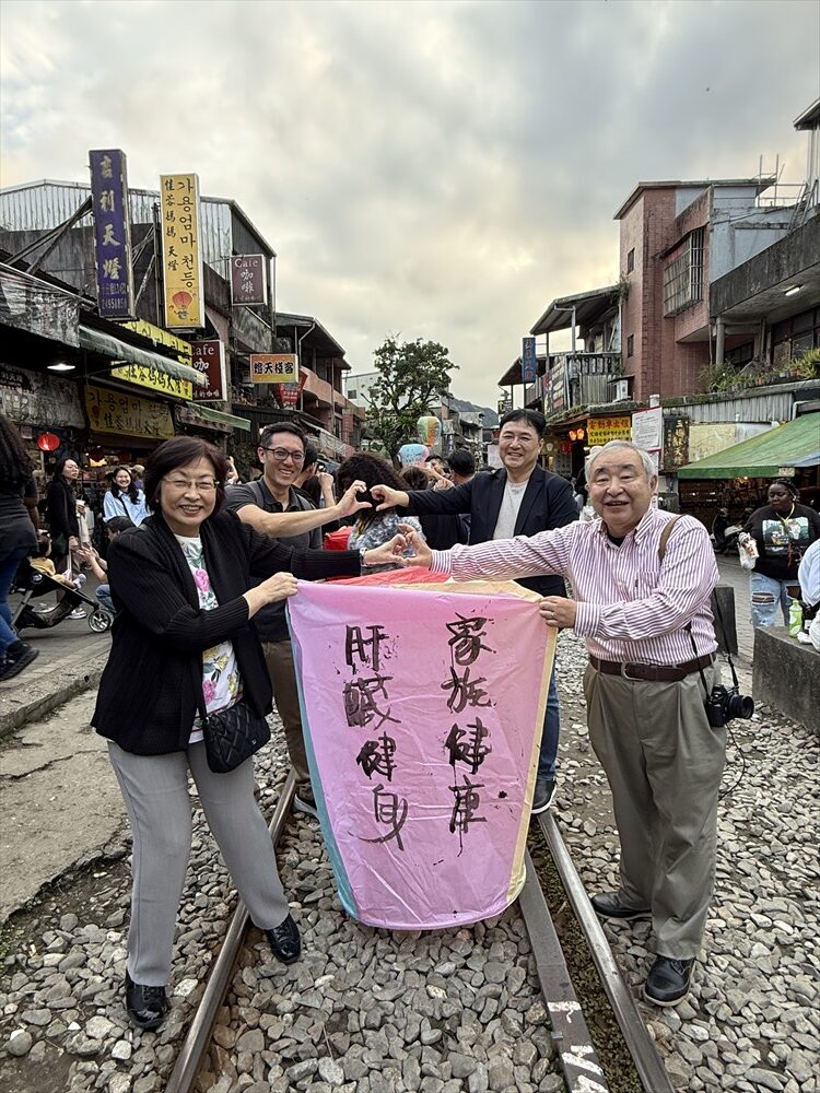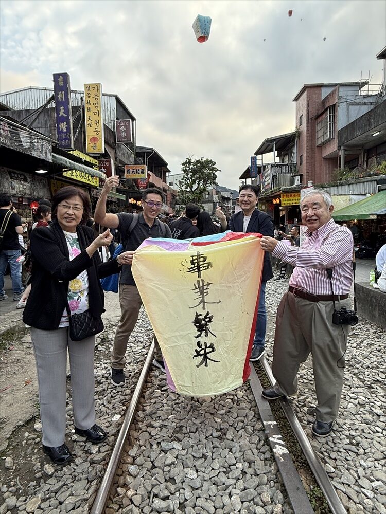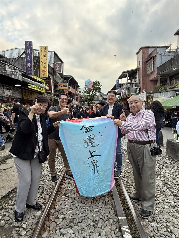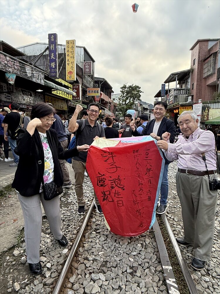 天燈を揚げる場所はれっきとした鉄道線路の中です。15分に一度くらいの割合で列車が通り、その度ごとに観光客は横の道路に撤収しますが、列車が通過するとまた中に入って天燈揚げを続けます。列車の運転手も手を振っているので、黙認して皆で楽しんでいるのでしょう。