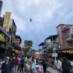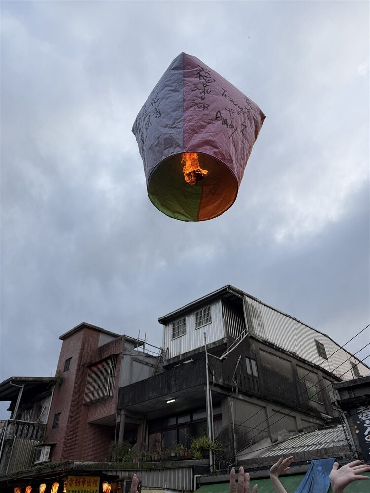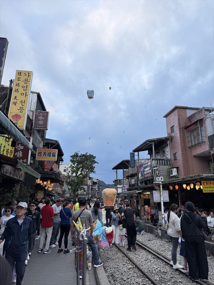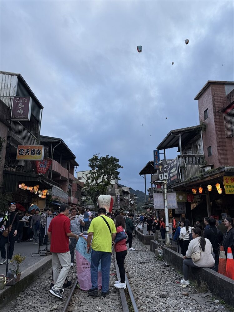 願い事などを書いた天燈と呼ばれるミニ熱気球を上げます。観光客でいっぱいですが日本のほかに各国からの観光客が多いようです。