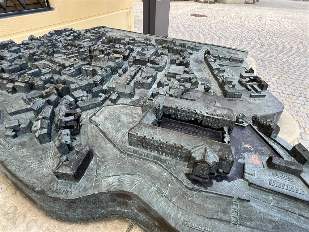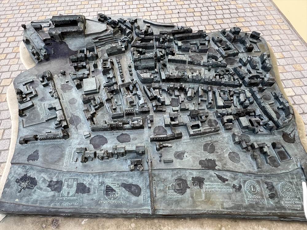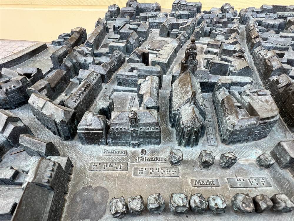 ドイツの町によくある金属製の町のパノラマです。中央正面のマルクト広場に Rathausと St.Marienが並んでいます
