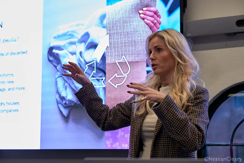 続いて登壇したのは、デンマークの企業アモリア(Amolia)の共同創業者であるリッケ・ティキエ氏です。同社は、テキスタイルをアップサイクルして新しい製品を作り出しています。彼女は、テキスタイルを持続可能な形でリサイクルすることは難しいと述べ、次のように付け加えました。「アップサイクルとは、すでに持っている素材を活用することなので、リサイクルする必要がありません。テキスタイルのリサイクルといえば、通常は素材を細かく砕いて、また新しいものを作ることを意味します」。