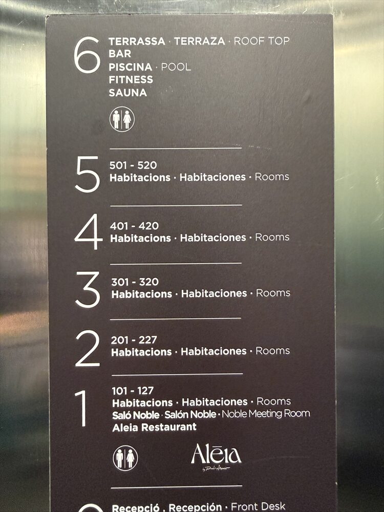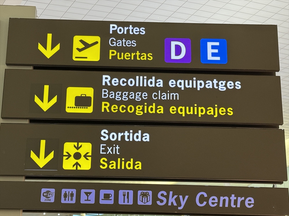 ここでは空港の看板や駅などの案内、ホテルなどの案内表記は3言語併記です。最初の白い文字がカタルーニャ語、その下が英語、3番目の黄色い文字がスペイン語です。カタルーニャ語とスペイン語はすごく似ていて違いといえば関東弁と関西弁程度、スペイン語とポルトガル語程度かも…